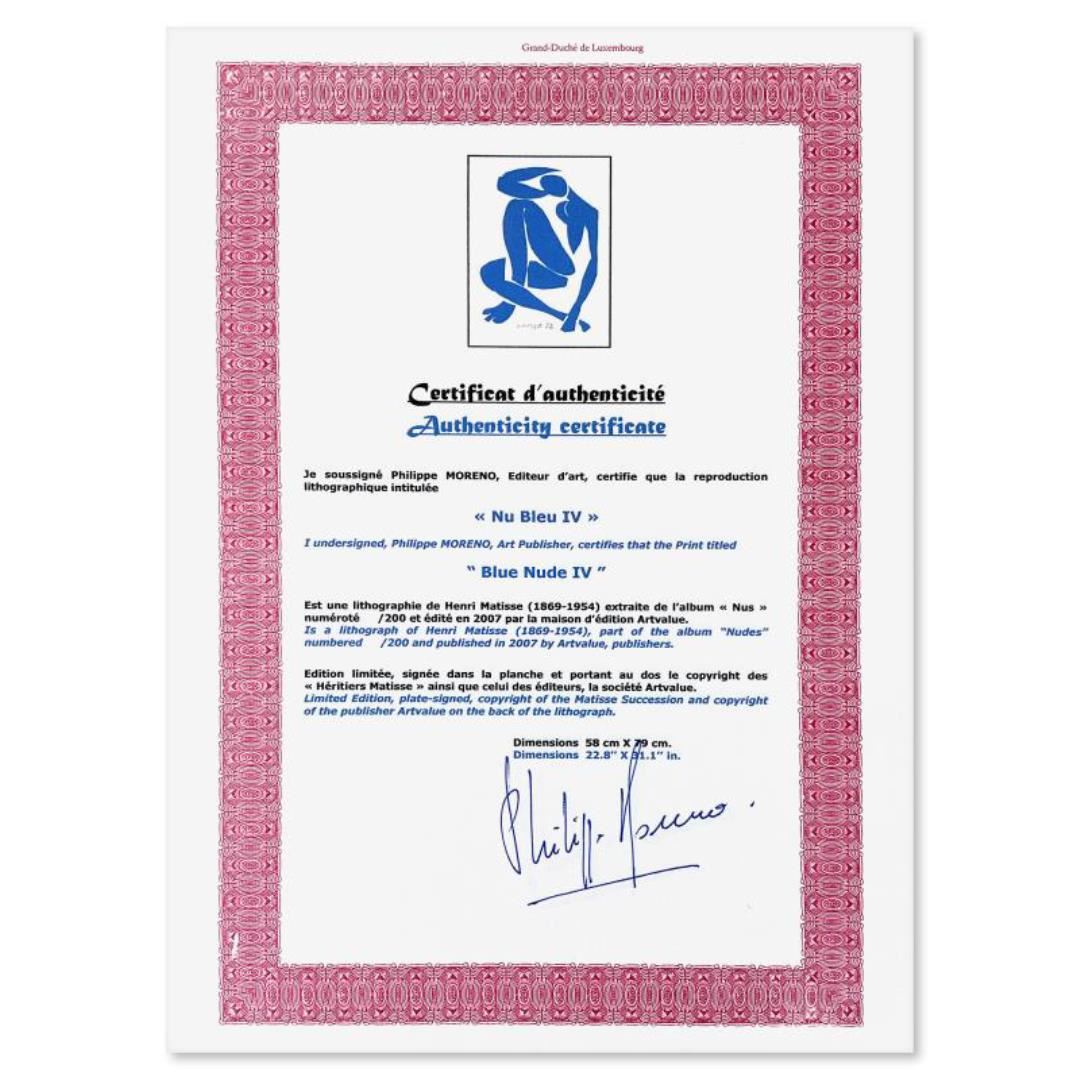 "Nu Bleu IV" is a limited edition lithograph by Henri Matisse (1869-1954) bearing the plate signature of the artist. This piece comes from an edition of 200 authorized by the Matisse Estate; the edition number is not on the piece itself but on the certificate. Includes Certificate of Authenticity. Measures approx. 22.5" x 31" (image).