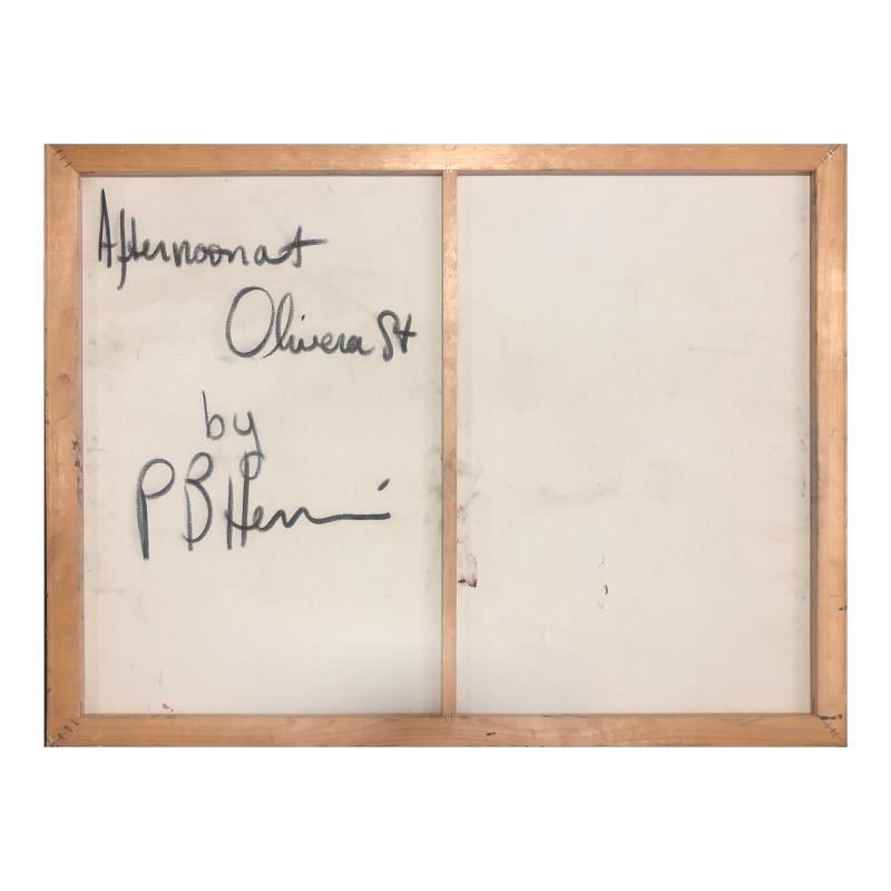 "Afternoon on Olivera St" is an original oil painting on stretched canvas by Paul Blaine Henrie (1932-1999). The piece is hand signed by the artist and comes with a letter of authenticity. Please note that due to the age of this piece and the way it was stored, there are minor sings of wear, particularly on the corners and edges. Measures approximately. 30" x 40" (image).