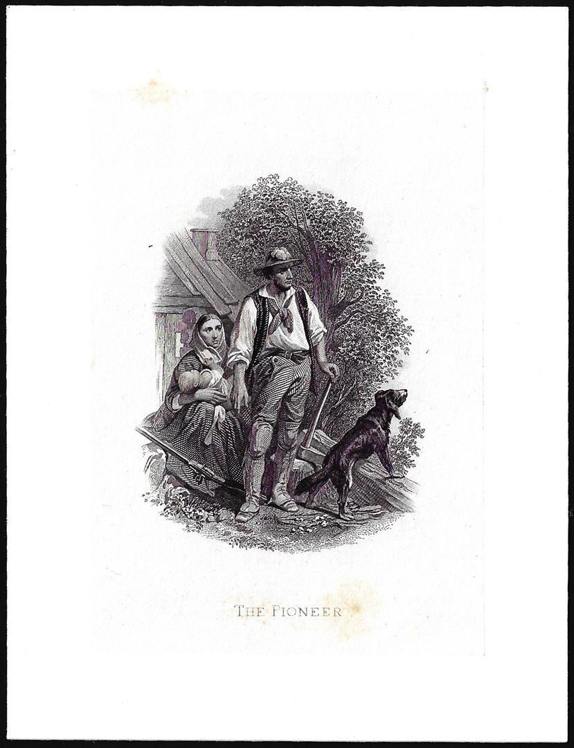 Henry Gugler's famous engraving of "The Pioneer" which appears on the very popular Series 1869 and later large size $5 Woodchopper United States Notes. Vignette depicts a pioneer family and their faithful dog; the man leans on an axe, while the woman clut