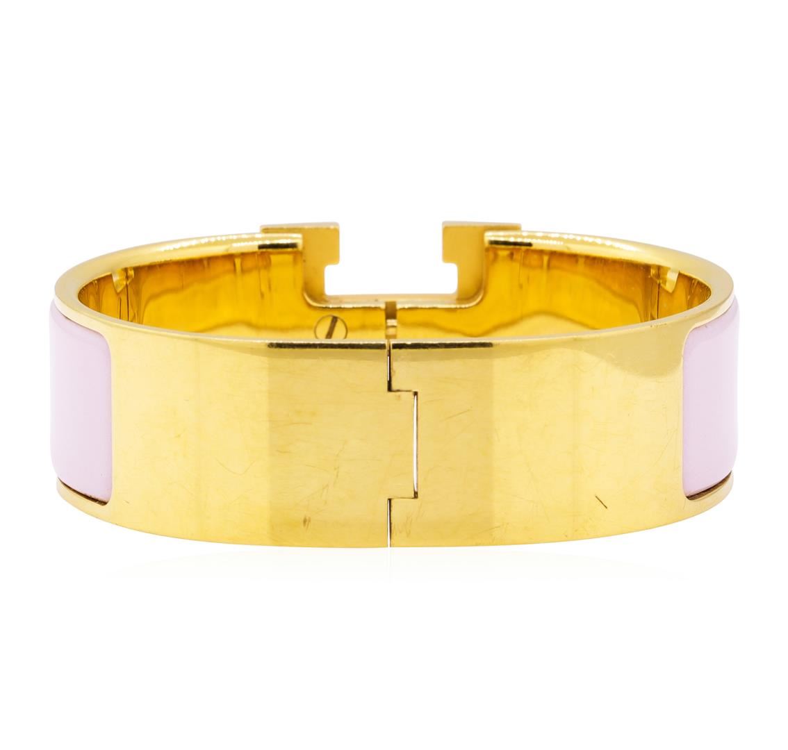 One Hermes Clic H bracelet with pink enamel featuring: 18KT gold plated metal weighing 67 grams. The bracelet has a circumference of 7".