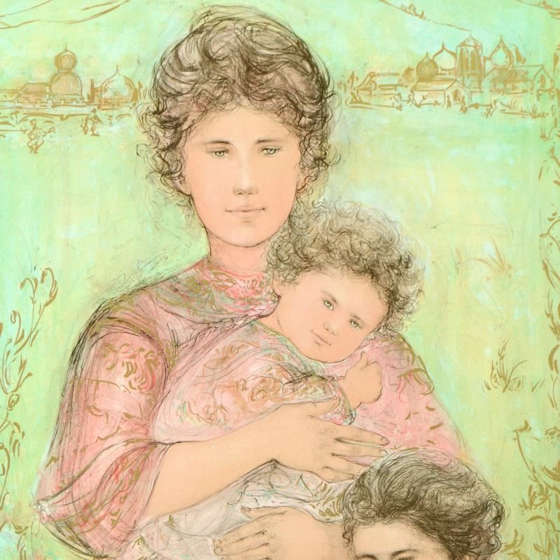 "Tatyana's Family" is a limited edition lithograph on paper by Edna Hibel (1917-2014), numbered and hand signed by the artist. Includes Certificate of Authenticity. Measures approx. 29.5" x 41.5" (border), 28" x 39" (image).