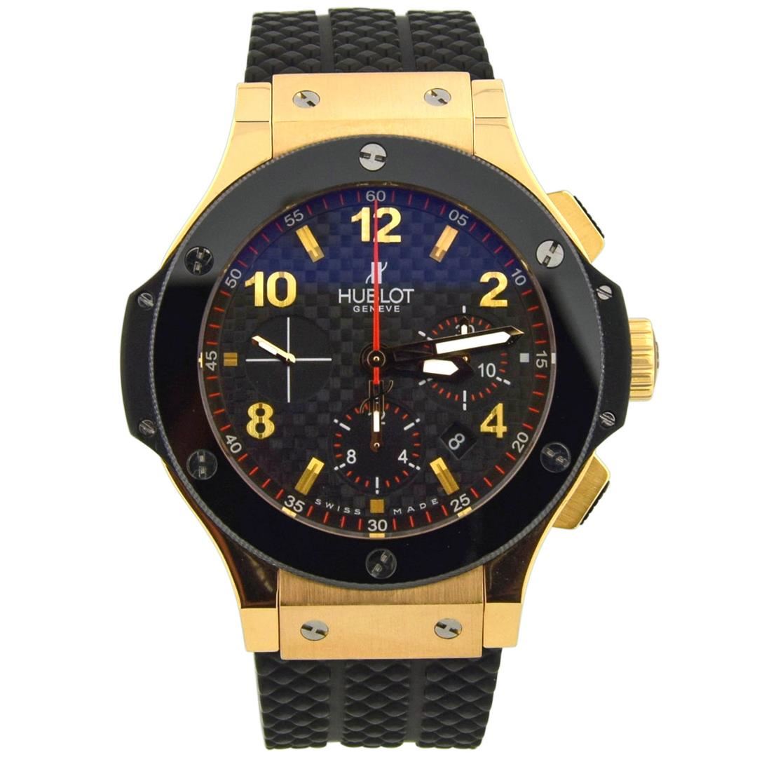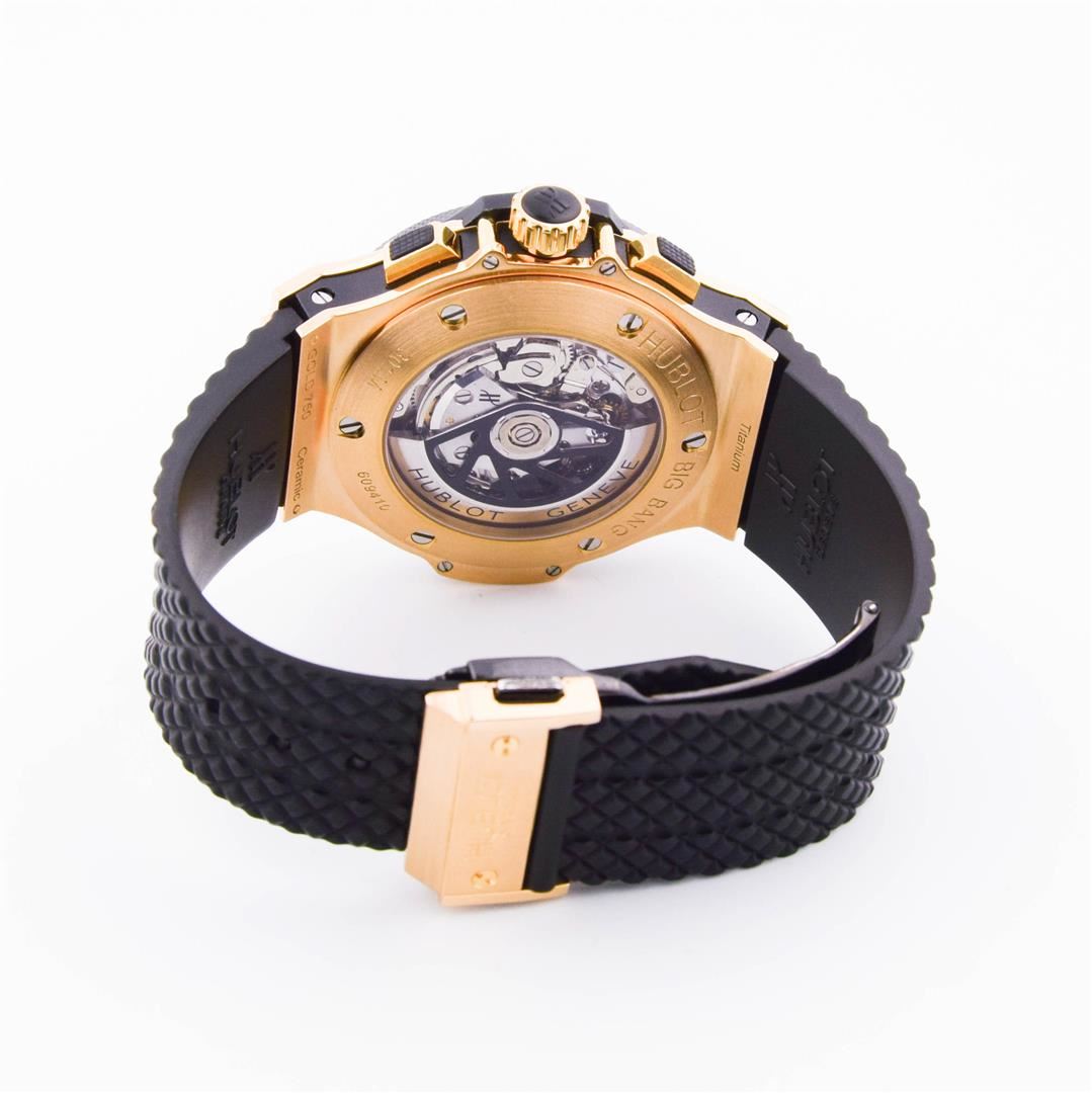 Hublot Big Bang Mens 44mm Black Fiber Dial 18KT Rose Gold & Ceramic Polished & Electronically Tested. Model: Big Bang 301.M. Case: 18KT Rose Gold,Ceramic and Titanium. Crystal: Sapphire. Bracelet: Rubber Strap. Adjustable Standard Clasp. Dial: Original Black Carbon Fiber. Movement: Automatic Winding Movement. Water Resistant: Yes. Case Size: 44mm. Condition: Pre Owned, Watch is free of all Scratches and Dents, Mint G-8.