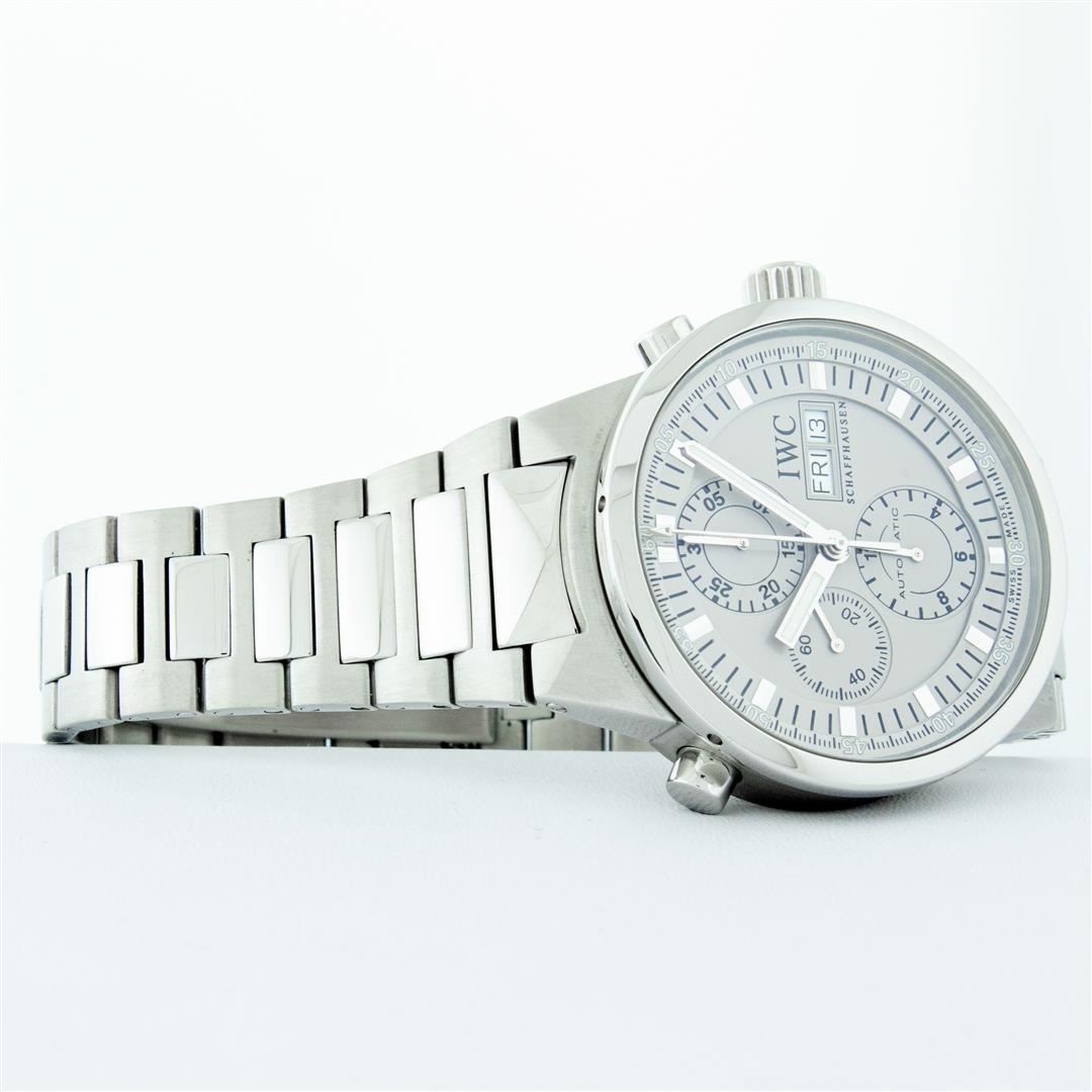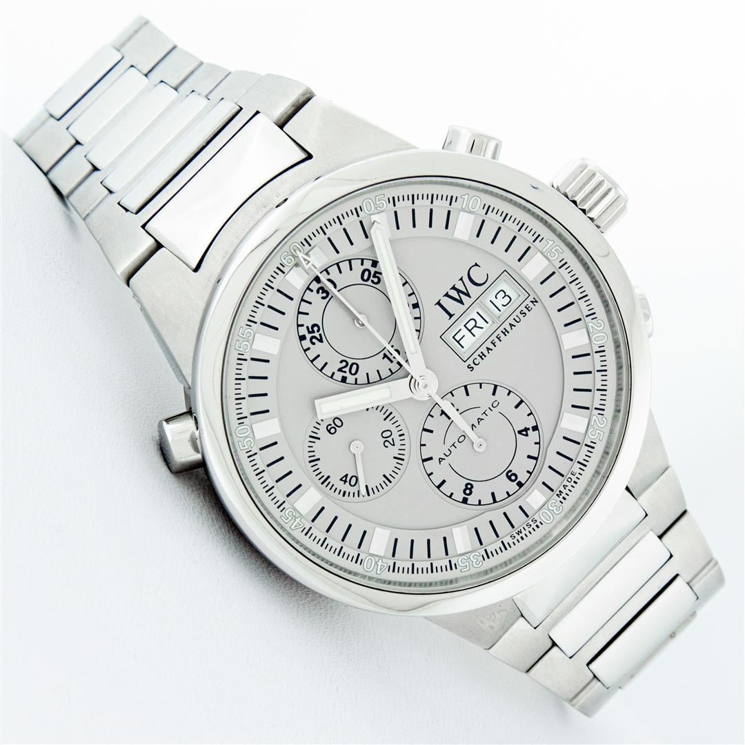 One Men's IWC Stainless Steel GST Rattrapante Split Second Chronograph Polished bright with Satin Finish, This Watch Has Been Serviced & Electronically Tested, Stainless Steel Case: 43mm, Stainless Steel Crown. Bezel: Stainless Steel Smooth Bezel, Crystal: Sapphire Crystal. Hands: IWC Silver Baton Markers, Movement: Handmade Swiss Automatic Movement. 3 Sub Dials: 60 Second, 30 Minute and 12 Hour Dial: IWC Grey Dial, Window: 3 O'clock Position Date Display, Functions: Chronograph, Rattrapante, Date, Day, Hour, Minute, Small Second. Model : GST Split Second Chronograph Rattrapante. Condition: G-6 Extra Fine. Bracelet: Stainless Steel IWC GST Bracelet, Bright Polish & Satin Finish. 8.0 Inch Length, Adjustable. Stainless Steel IWC Deployant Clasp. This Watch Has Been Serviced Time Tested And Is In Excellent Condition, It Is Free Of All Scratches And Dents (Small Scratch On Original Crystal)