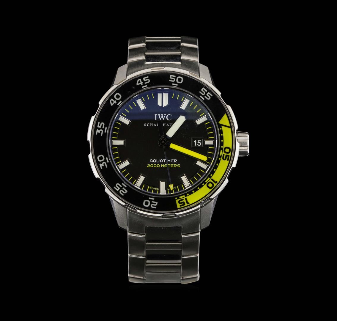 One IWC Aquatimer Stainless Steel Bracelet 44mm Case Black Dial Black/Yellow Bezel Watch IW3551955 Stainless steel case (44mm diameter, 15mm thickness) with rotating diving bezel and screw-down crown, stainless steel bracelet with quick-change system, black dial with yellow minute hand and 15 minute register, luminescent elements on hands, dial, and rotating bezel, date display at 3 o'clock, 25 jewel Caliber 79320 self-winding mechanical chronograph movement with 44 hour power reserve, scratch-resistant sapphire crystal.