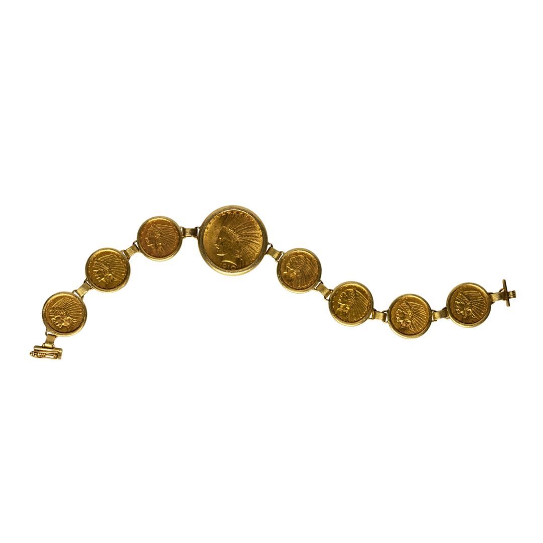 This Unique 18KT Gold Coin Bracelet contains (7) $2 1/2 Indian Head Quarter Eagle Gold Coins & One 1910 $10 Indian Head Eagle Gold Coin.