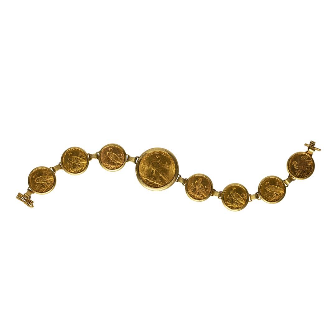This Unique 18KT Gold Coin Bracelet contains (7) $2 1/2 Indian Head Quarter Eagle Gold Coins & One 1910 $10 Indian Head Eagle Gold Coin.