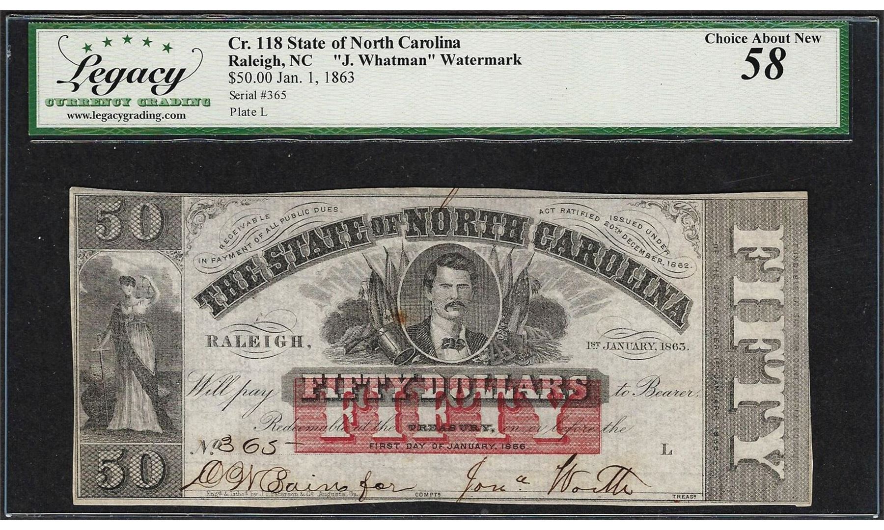 One Jan. 1, 1863 $50 State of North Carolina Obsolete Note Cr.118 Legacy Ch. About New 58. Legacy Graded.