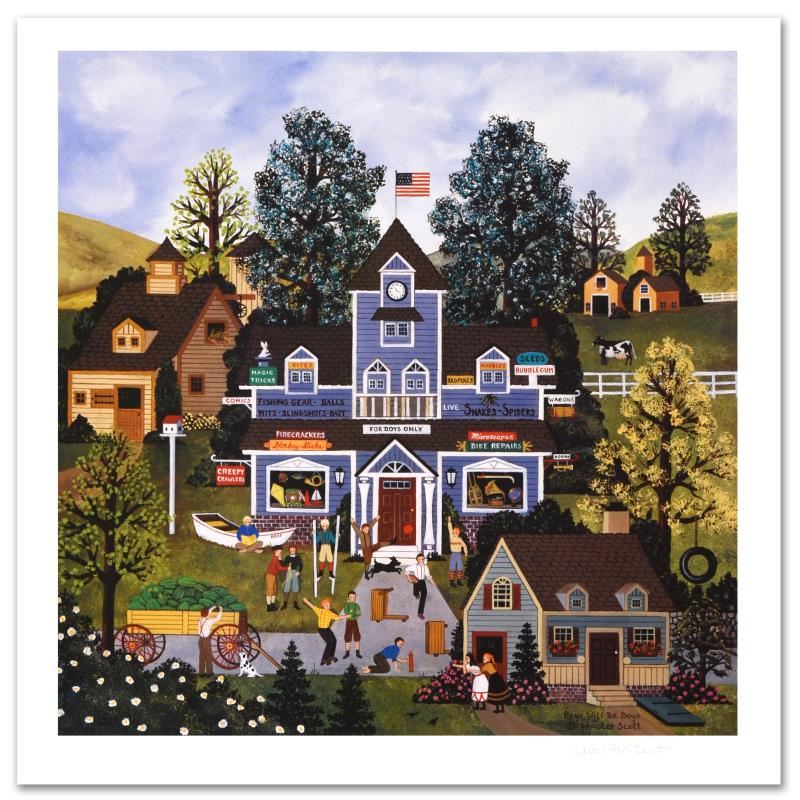 Cozy, down-home images of a bygone era when life was simpler - this is the feeling captured in the creations of one of the world's most recognized artists. "Boys Will Be Boys" is a limited edition lithograph on paper, numbered and hand signed by Wooster Scott. Includes letter of authenticity. Measures approx. 20" x 21" (with border), 18" x 18" (image).