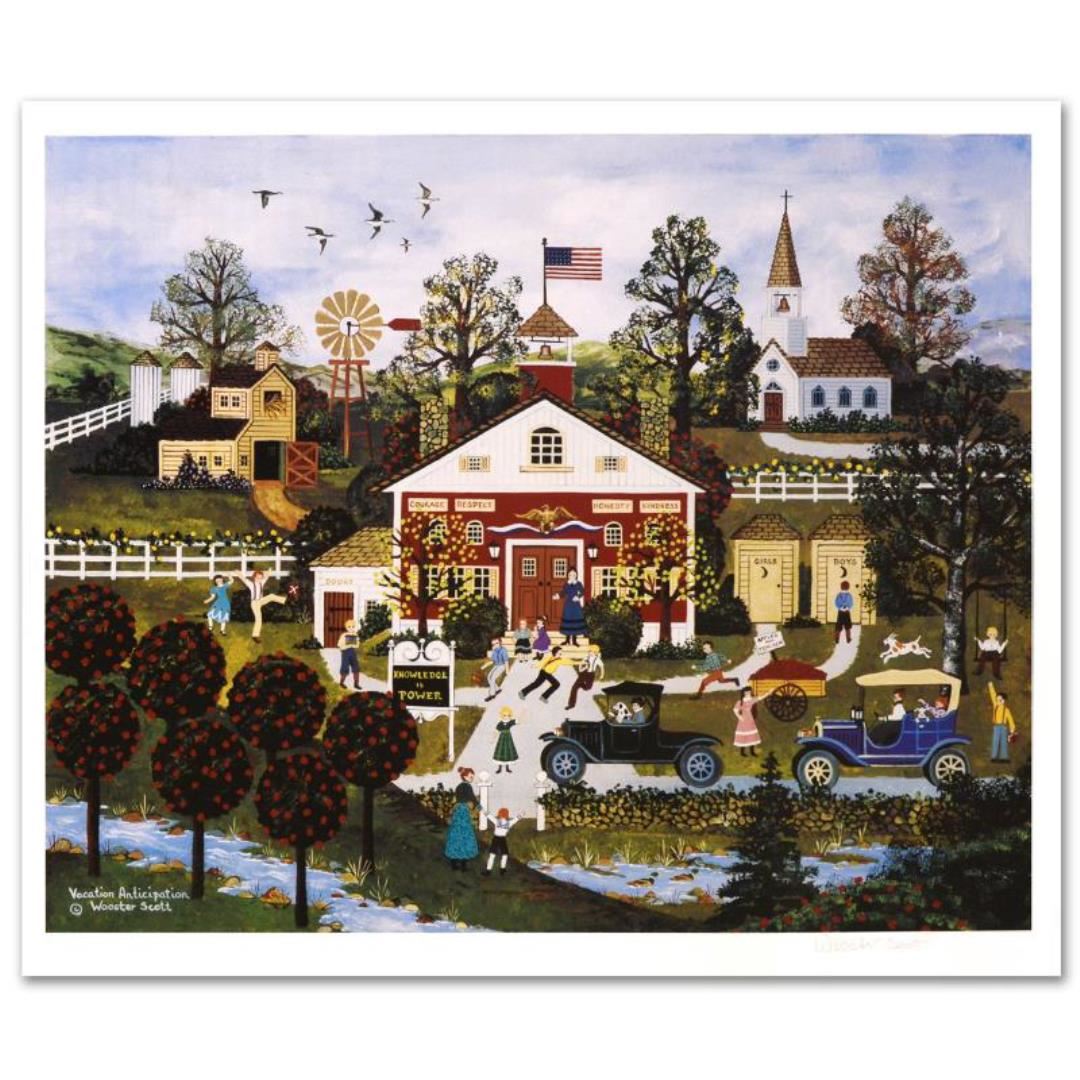 Cozy, down-home images of a bygone era when life was simpler - this is the feeling captured in the creations of one of the world's most recognized artists. "Vacation Anticipation" is a limited edition lithograph on paper, numbered and hand signed by Wooster Scott. Includes letter of authenticity. Measures approx. 22" x 19.5" (with border), 20" x 16" (image)