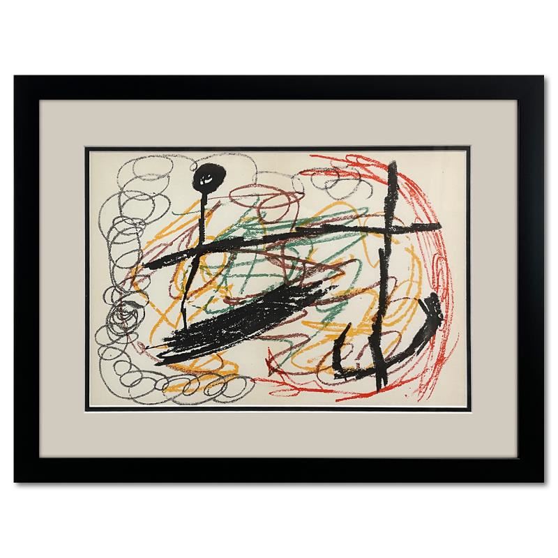 This is a lithograph on paper by Joan Miro (1893-1983). This piece comes custom framed. Includes Letter of Authenticity. This lithograph originally came in a book and was folded so there is as slight crease in the center. All examples of this lithograph are this way and it is not a flaw. Measures approx. 24" x 18.5" (frame), 17" x 11" (image).