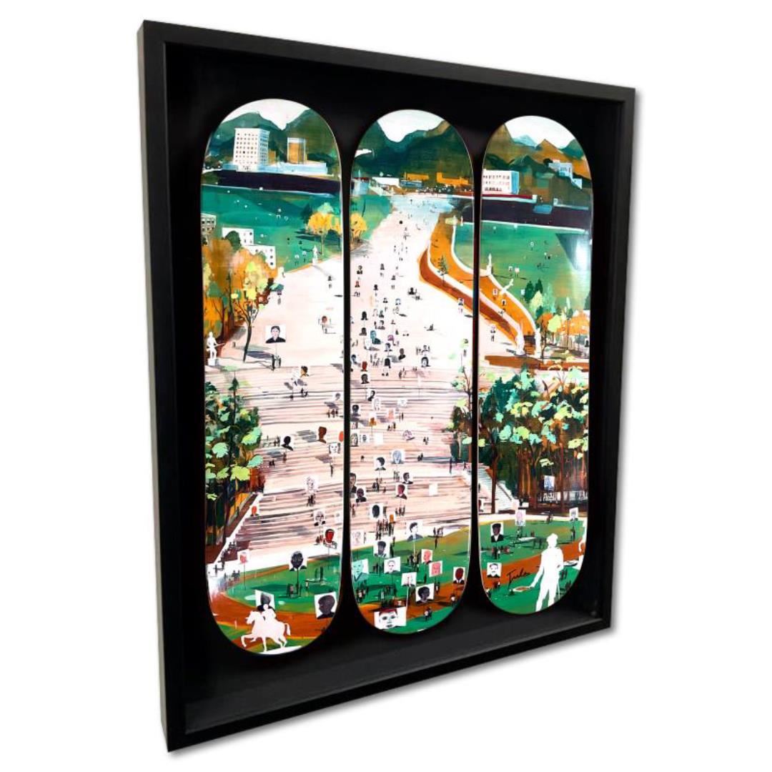 "Idol Hands" is a limited edition skateboard triptych by Jules de Balincourt, numbered and hand signed by the artist inverso. This triptych comes custom framed. Includes Letter of Authenticity. Measures approx. 30" x 37" x 3" (frame), 24" x 32" (skateboards).
