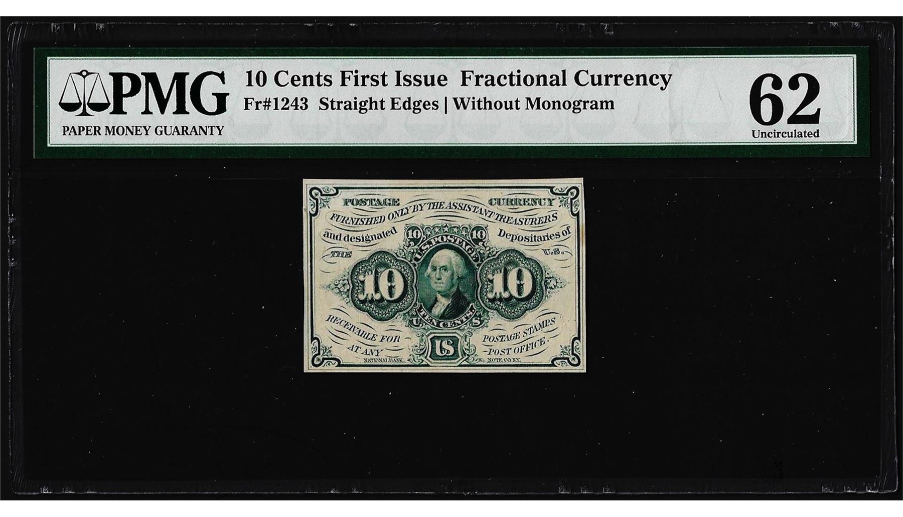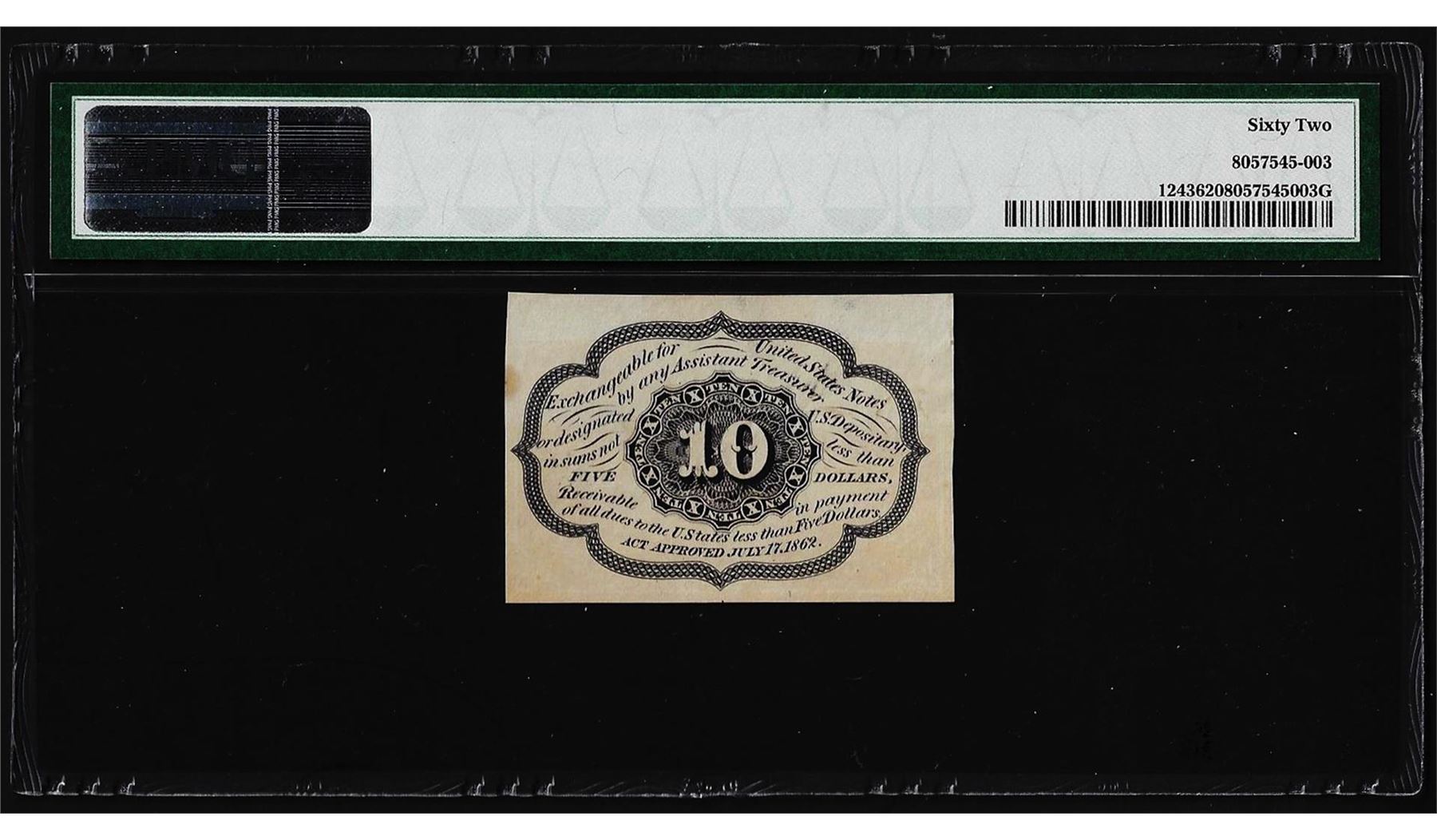 One July 17, 1862 10 Cents First Issue Fractional Currency Note PMG Uncirculated 62. PMG Certified.