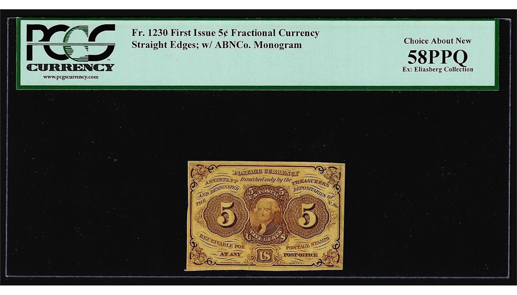 One July 17, 1862 First Issue 5 Cent Fractional Currency Note PCGS Choice About New 58PPQ. PCGS Graded.