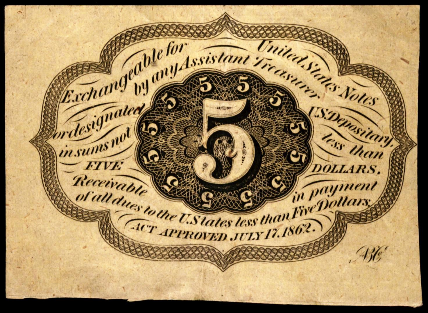 One July 17, 1862 First Issue Five Cents Fractional Currency Note.