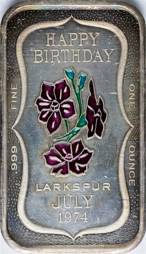 One July 1974 Happy Birthday Enamel Silver Art Bar.