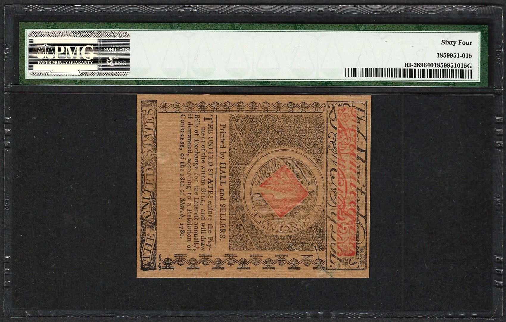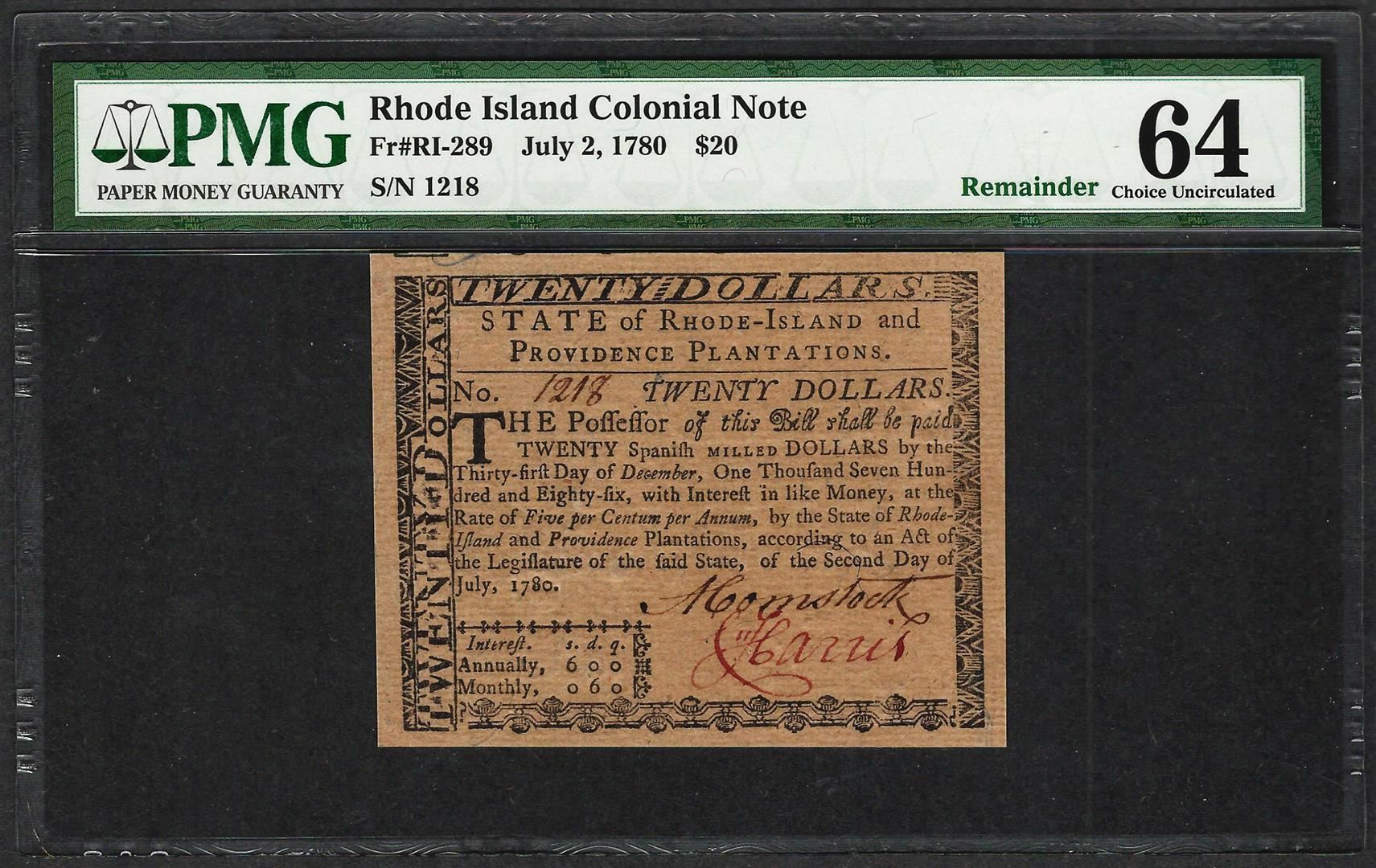 One July 2, 1780 $20 Rhode Island Colonial Currency Note Fr.RI-289 PMG Uncirculated 64. PMG Certified.