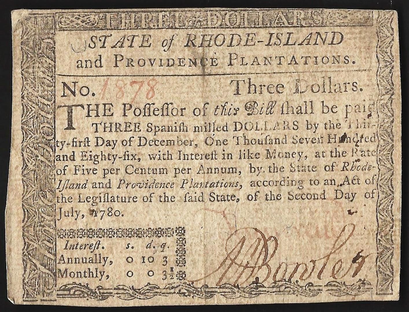 One July 2, 1780 $3 Rhode Island Colonial Currency Note.