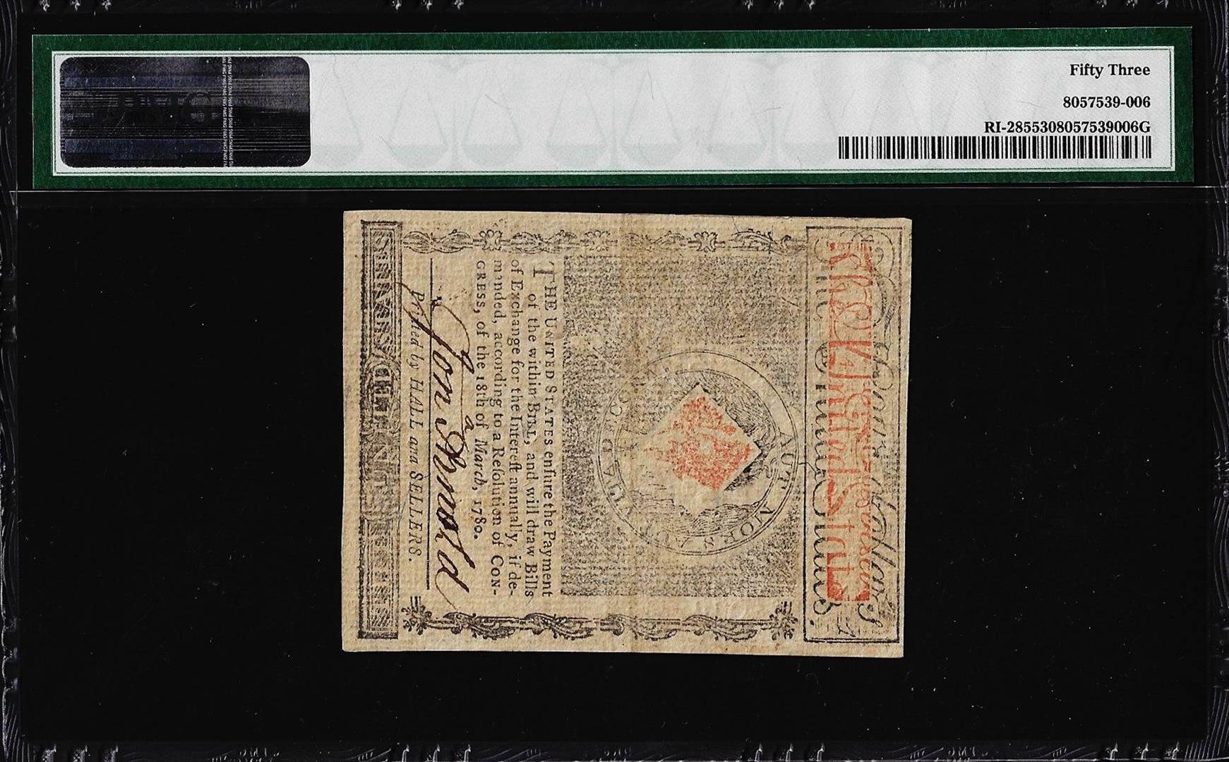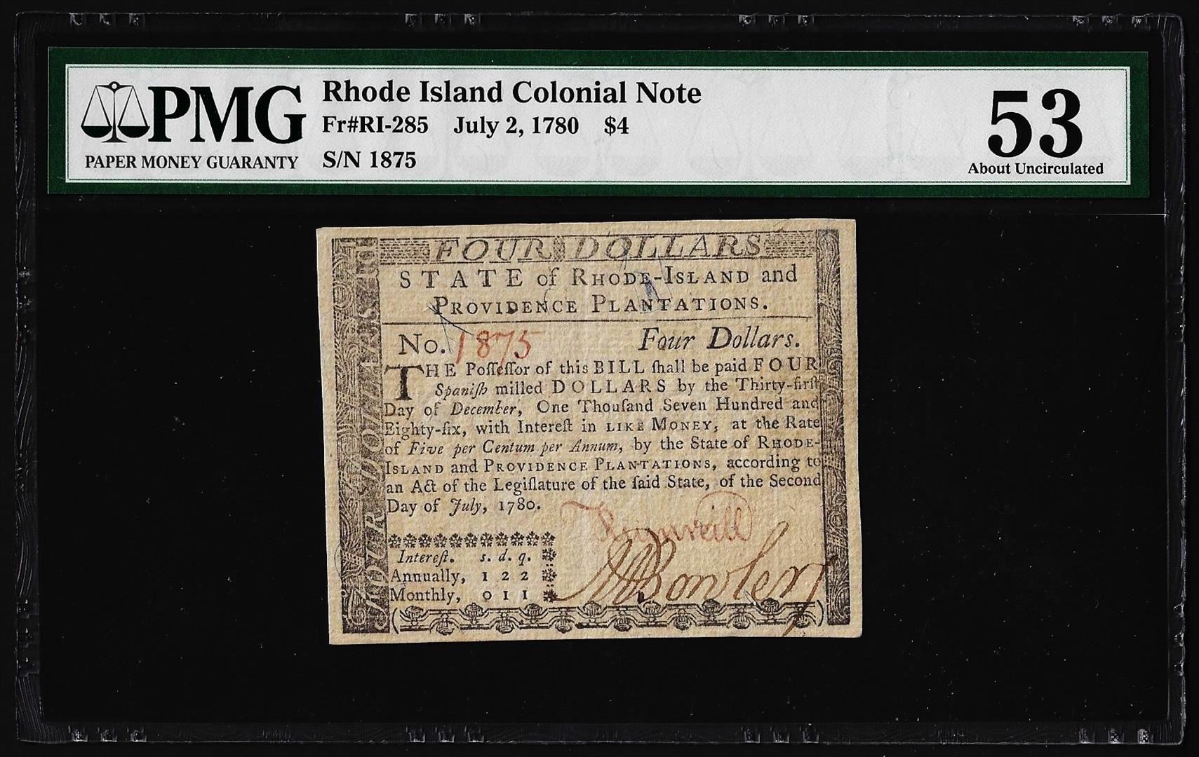 One July 2, 1780 Rhode Island $4 Colonial Currency Note RI-285 PMG About Uncirculated 53. PMG Certified.