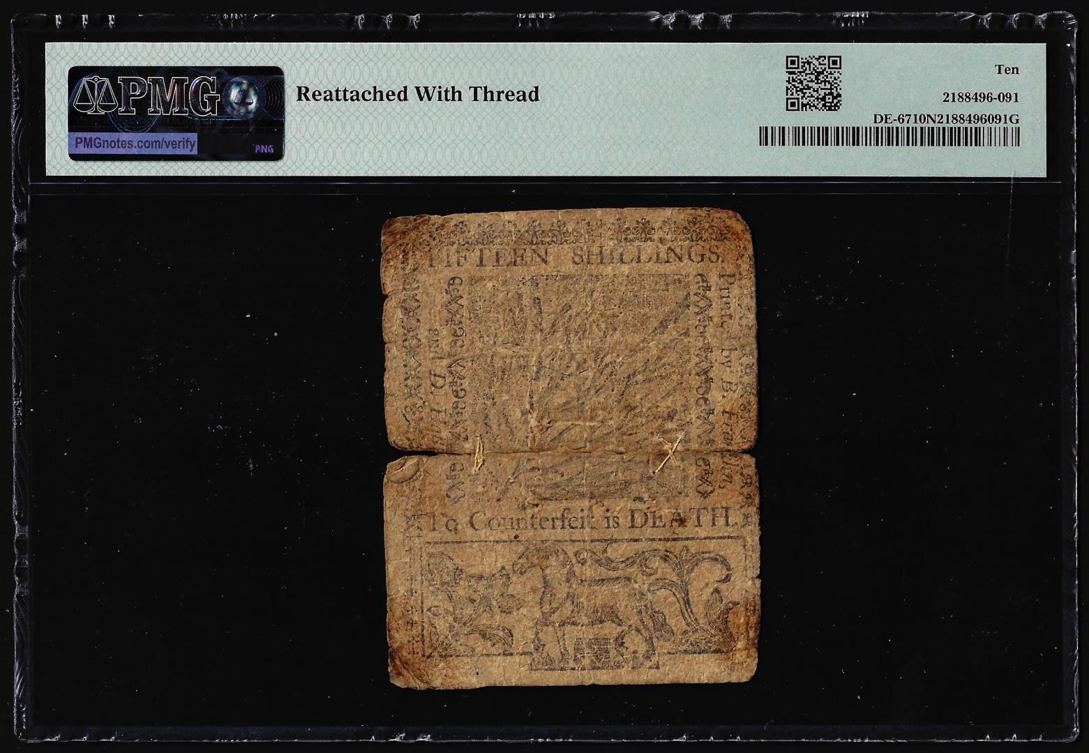 One June 1, 1759 Delaware 15 Shillings Colonial Currency Note DE-67 --- Grade. PMG Certified.