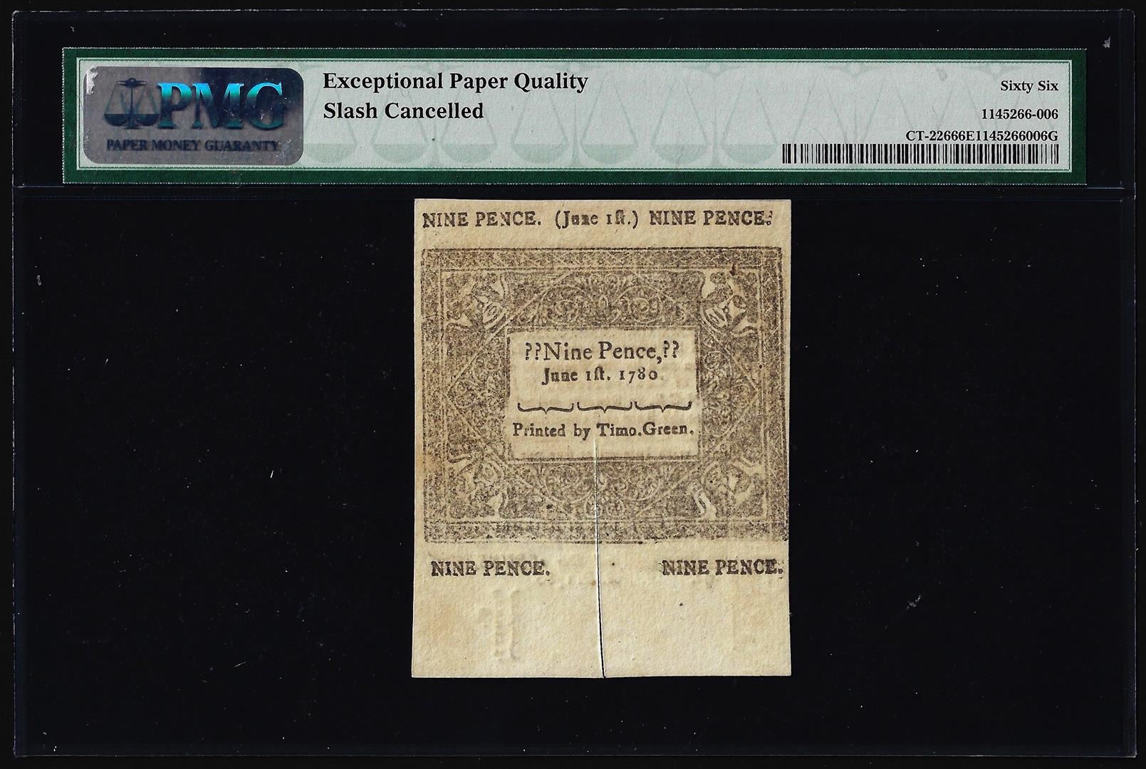 June 1, 1780 Connecticut 9 Pence Colonial Note Fr. CT-226 PMG Gem Uncirculated 66EPQ