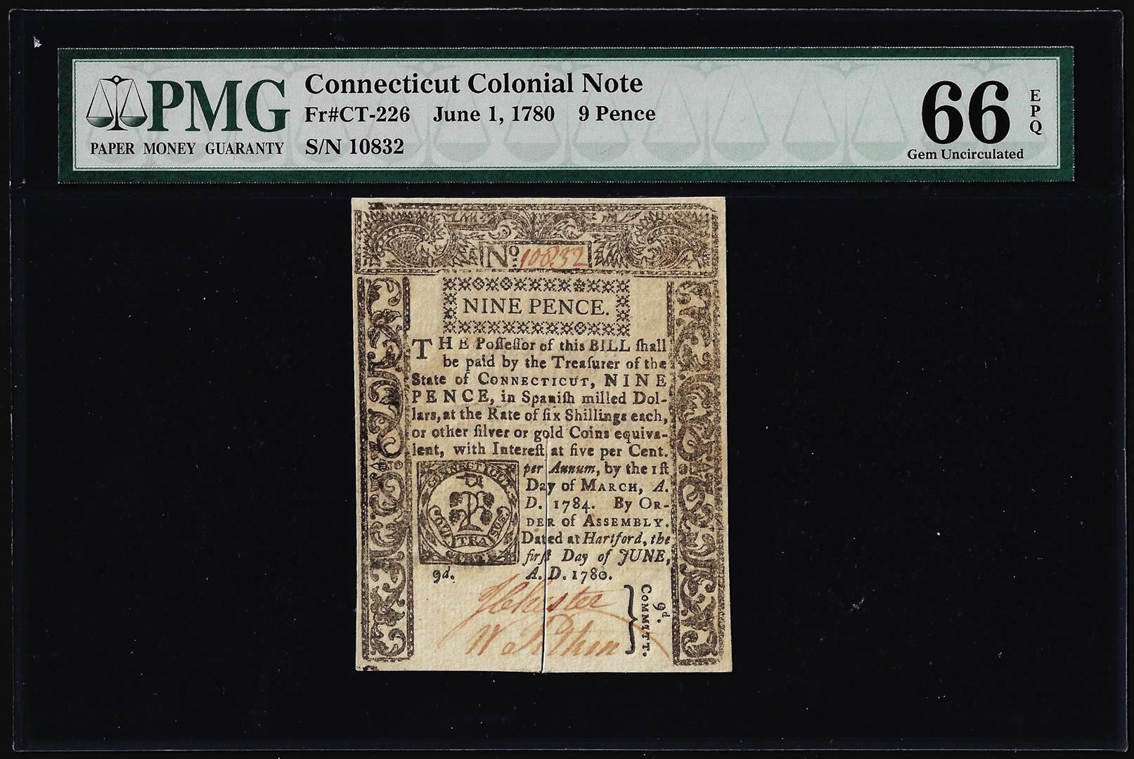 June 1, 1780 Connecticut 9 Pence Colonial Note Fr. CT-226 PMG Gem Uncirculated 66EPQ