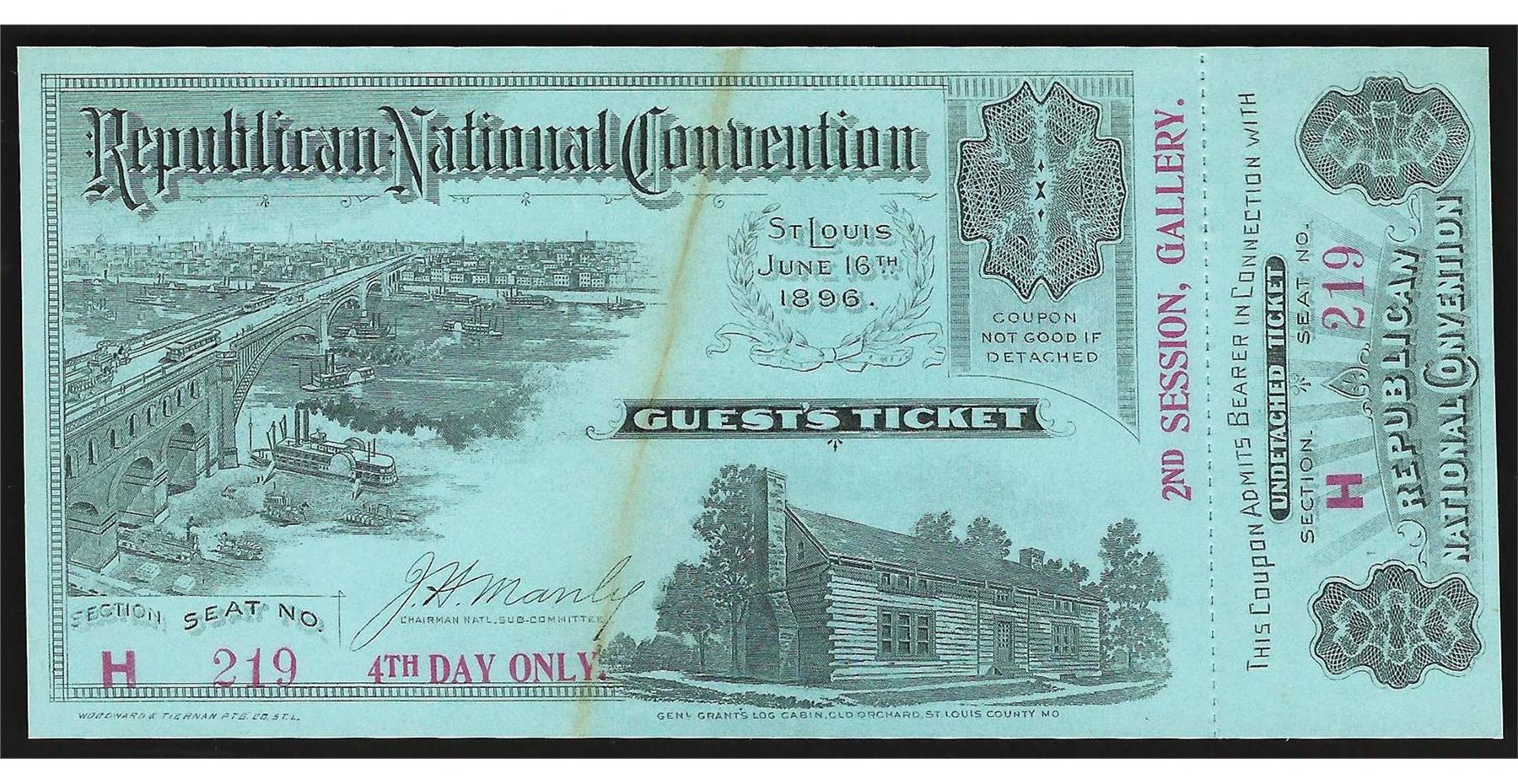 One June 16th 1896 Republican National Convention St. Louis Ticket.