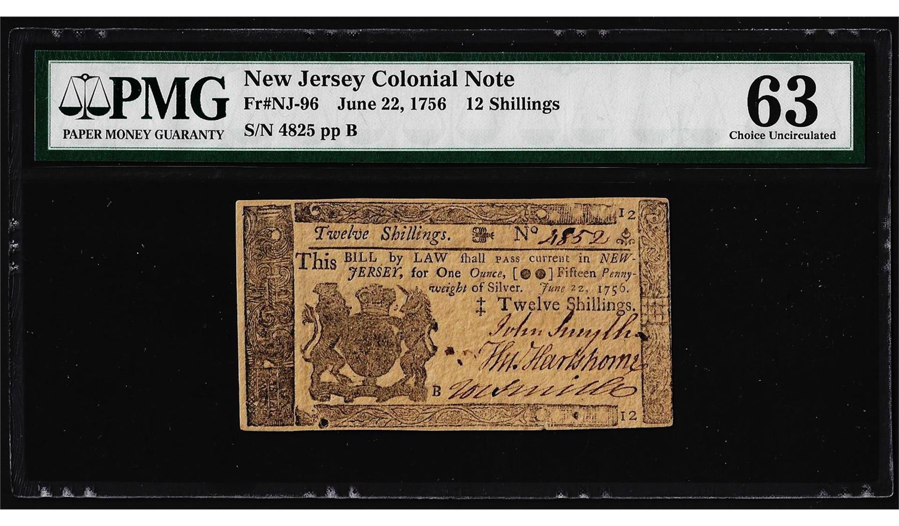 June 22, 1756 New Jersey 12 Shillings Colonial Currency Note PMG Choice Unc. 63