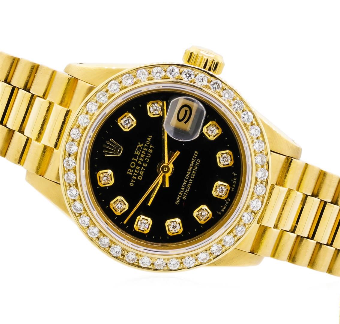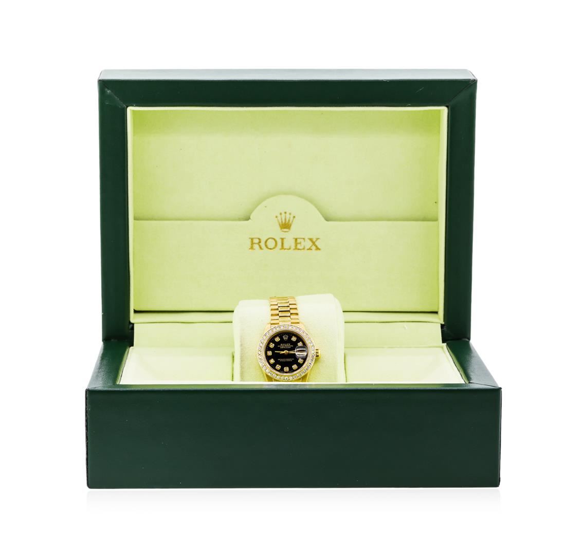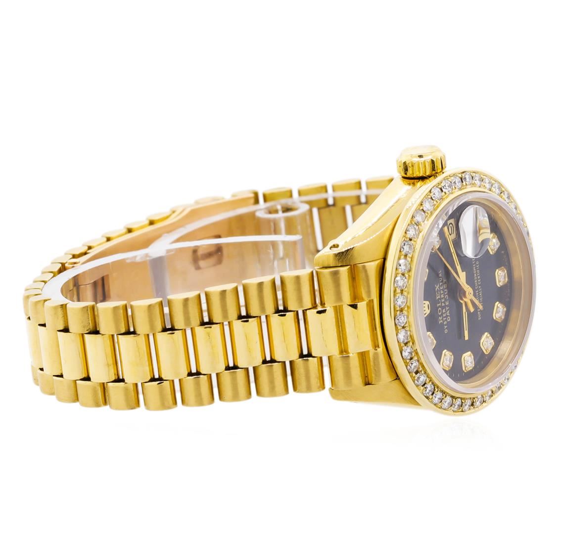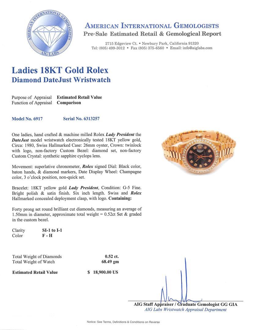 One ladies, hand crafted & machine milled Rolex Lady President the DateJust model wristwatch electronically tested 18KT yellow gold, Circa: 1980, Swiss Hallmarked Case: 26mm oyster, Crown: twinlock with logo, non-factory Custom Bezel: diamond set, non-factory Custom Crystal: synthetic sapphire cyclops lens. Movement: superlative chronometer, Rolex signed Dial: Black color, baton hands, & diamond markers, Date Display Wheel: Champagne color, 3 o'clock position, non-quick set. Bracelet: 18KT yellow gold Lady President, Condition: G-5 Fine. Bright polish & satin finish. Six inch length. Swiss and Rolex Hallmarked concealed deployment clasp, with logo. Containing: Forty prong set round brilliant cut diamonds, measuring an average of 1.50mm in diameter, approximate total weight = 0.52ct Set & graded in the custom bezel. Clarity SI-1 to I-1. Color: F - H. Total Weight of Diamonds 0.52ct. Total Weight of Watch 68.49gm. This watch also comes with Appraisal and Box. AIG Appraised at $18,900.00.
