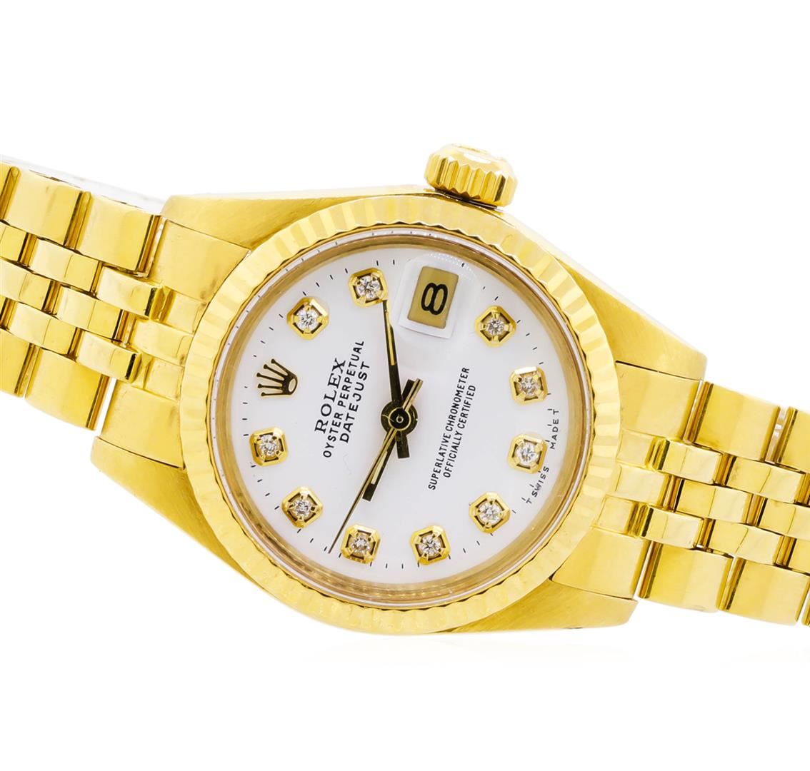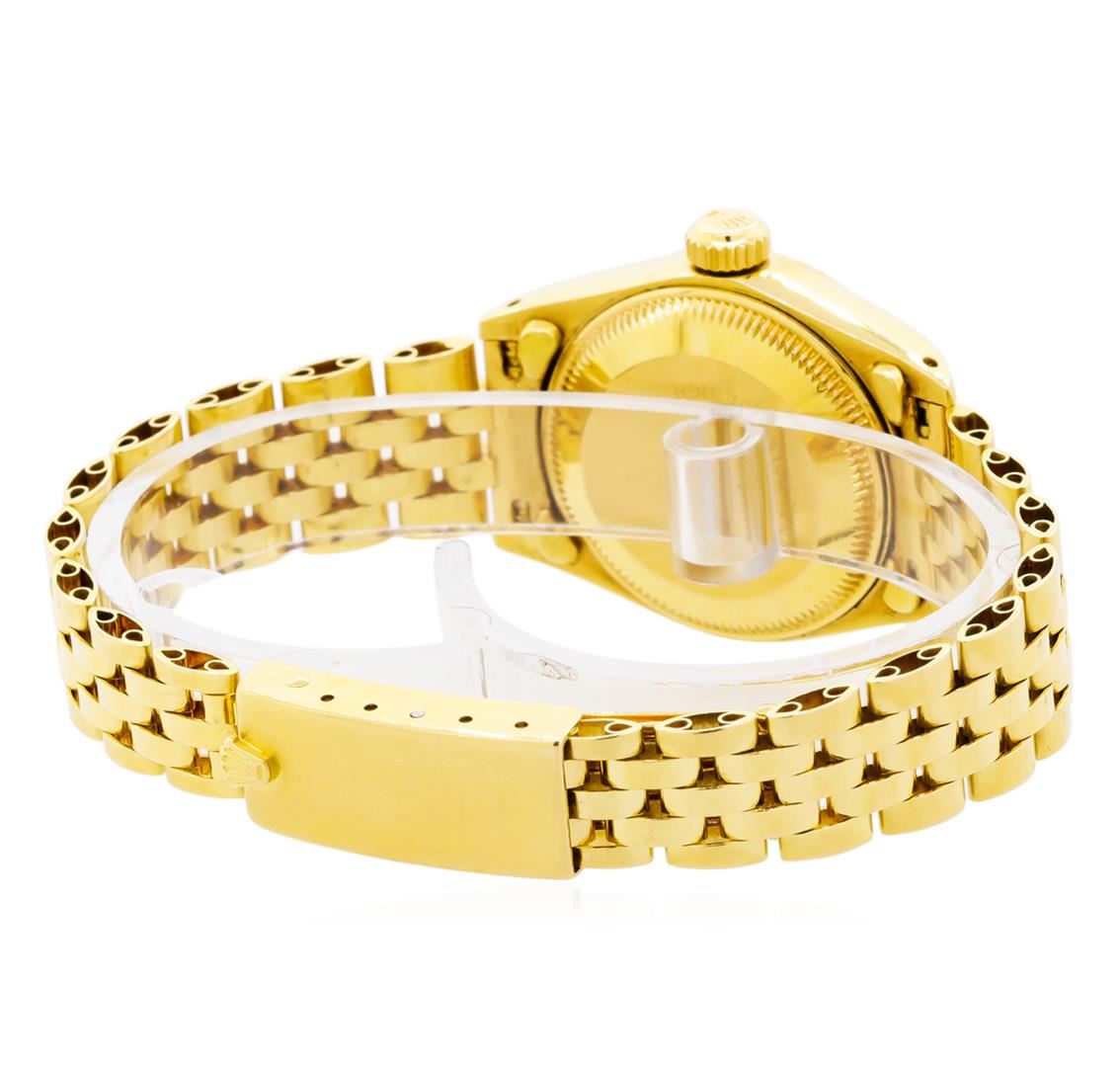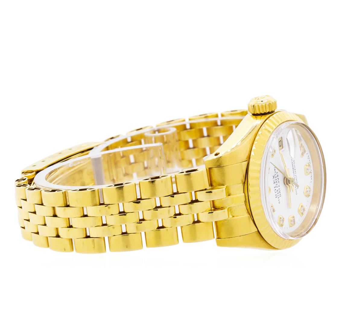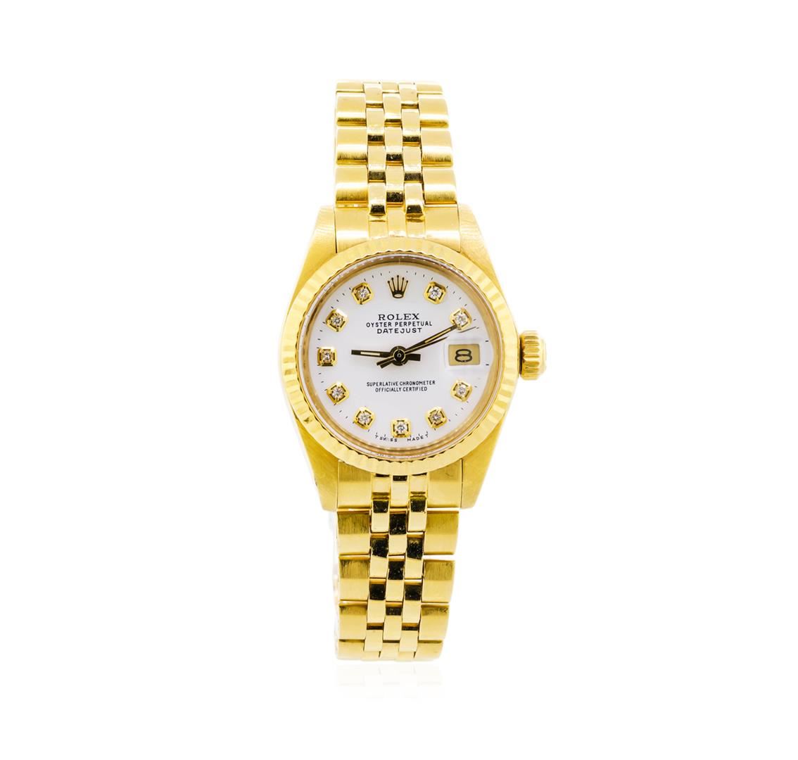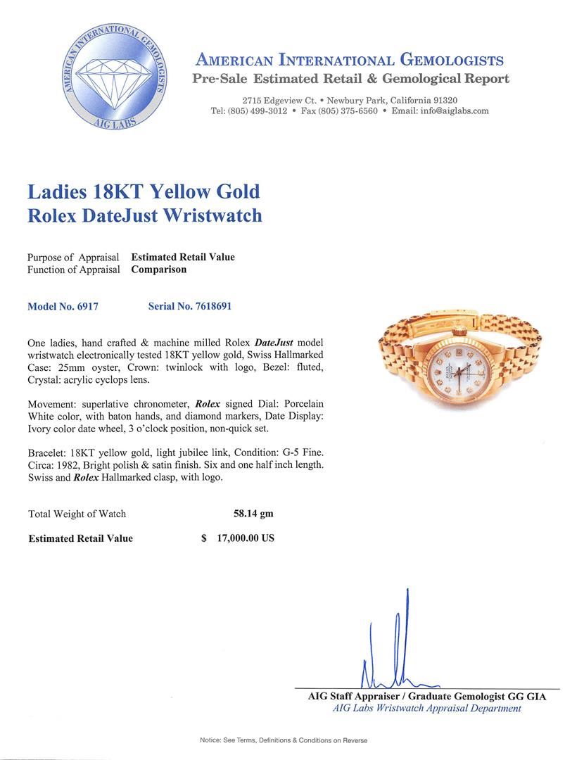 One ladies, hand crafted & machine milled Rolex DateJust model wristwatch electronically tested 18KT yellow gold, Swiss Hallmarked Case: 25mm oyster, Crown: twinlock with logo, Bezel: fluted, Crystal: acrylic cyclops lens. Movement: superlative chronometer, Rolex signed Dial: Porcelain White color, with baton hands, and diamond markers, Date Display: Ivory color date wheel, 3 o'clock position, non-quick set. Bracelet: 18KT yellow gold, light jubilee link, Condition: G-5 Fine. Containing: Ten prong set round brilliant cut diamonds, measuring 1.30 - 1.20 x 0.75mm (depth est.) approximate total weight of 10 Stones = 0.08ct. Graded in the setting. Clarity: VS-2 to SI-2. Color: G - I. Circa: 1982, Bright polish & satin finish. Six and one half inch length. Swiss and Rolex Hallmarked clasp, with logo. Total Weight of Watch 58.14gm. AIG Appraised at $17,000.00.