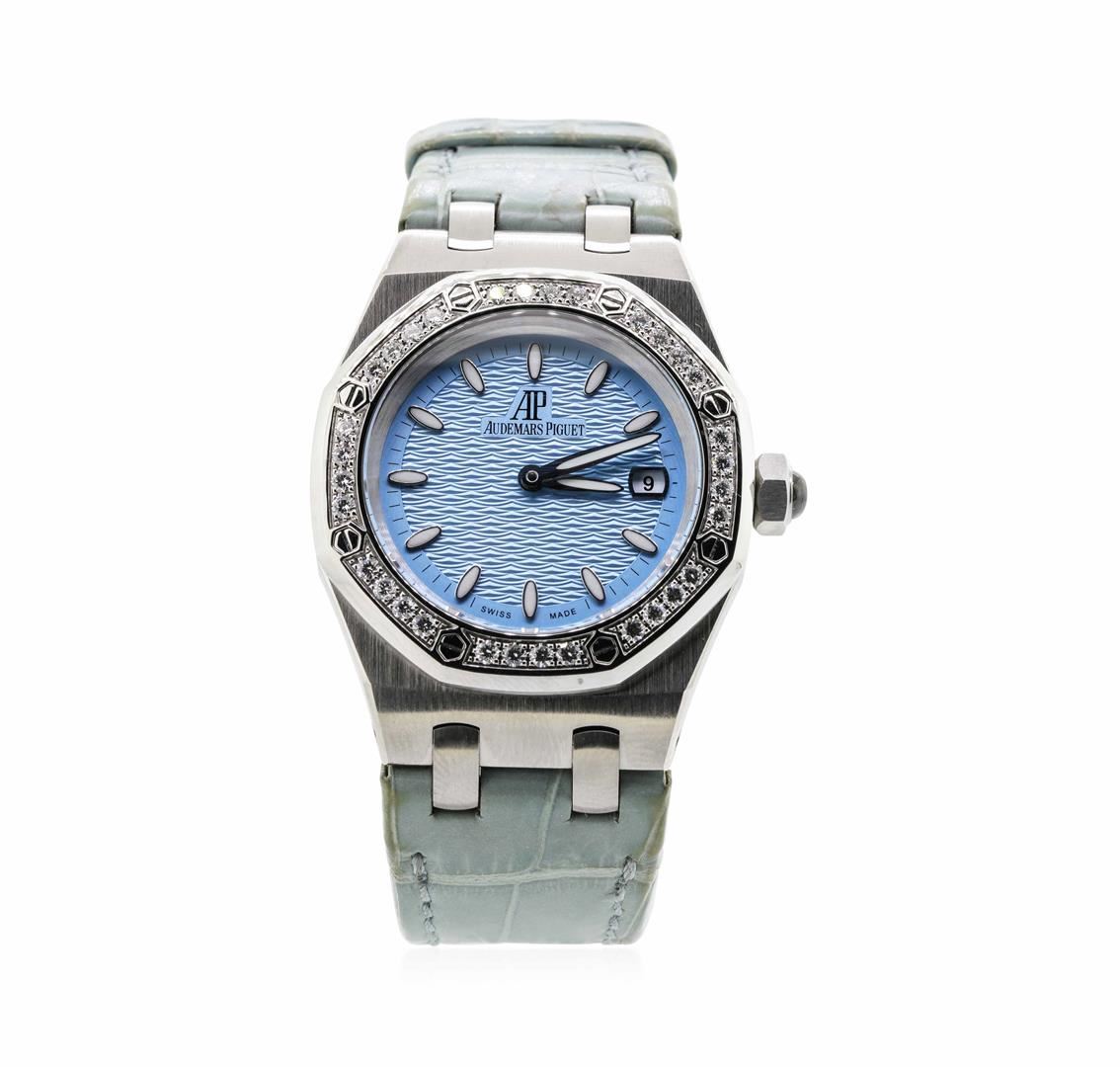 One Ladies Audemars Piguet Royal Oak wrist watch stainless steel, Bezel: diamond set octagon, Crystal: sapphire, Movement: automatic, Dial: blue guilloche with date at 3 o'clock with luminescent baton type hands and oval marker numerals, Bracelet: seafoam blue alligator leather, Condition: G-5 fine. Watch Model Number: 67601STZZD002CR01 Containing: Thirty-Two prong set round brilliant cut diamonds, measuring 2.00 - 1.95 x 1.21mm (depth est.) approximate total weight of 32 Stones = 0.92ct. Graded in the setting. Color F - G Clarity VS-1 to VS-2 Cut Very Good. Total Weight of Diamonds 0.92ct. Total Weight of Watch 56.60gm. GAS Appraised.