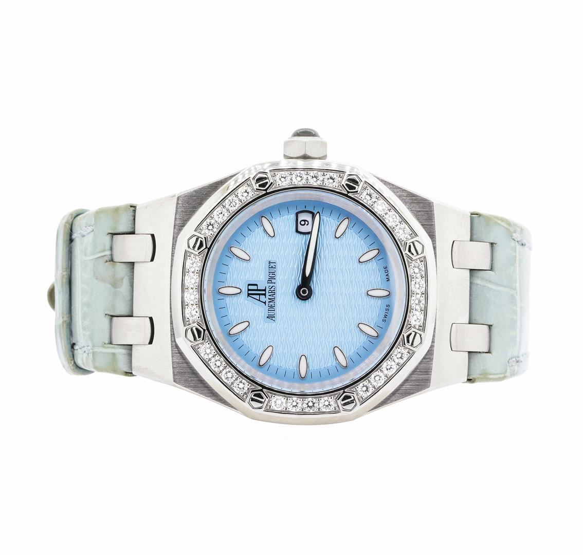 One Ladies Audemars Piguet Royal Oak wrist watch stainless steel, Bezel: diamond set octagon, Crystal: sapphire, Movement: automatic, Dial: blue guilloche with date at 3 o'clock with luminescent baton type hands and oval marker numerals, Bracelet: seafoam blue alligator leather, Condition: G-5 fine. Watch Model Number: 67601STZZD002CR01 Containing: Thirty-Two prong set round brilliant cut diamonds, measuring 2.00 - 1.95 x 1.21mm (depth est.) approximate total weight of 32 Stones = 0.92ct. Graded in the setting. Color F - G Clarity VS-1 to VS-2 Cut Very Good. Total Weight of Diamonds 0.92ct. Total Weight of Watch 56.60gm. GAS Appraised.