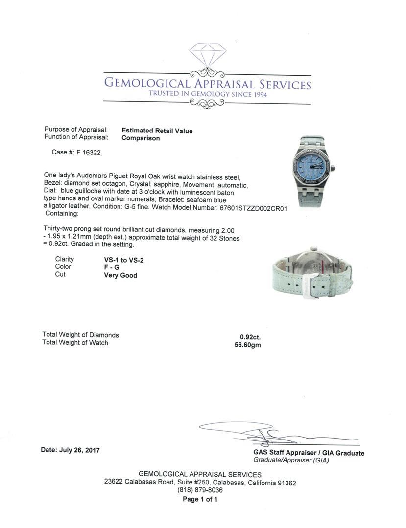 One Ladies Audemars Piguet Royal Oak wrist watch stainless steel, Bezel: diamond set octagon, Crystal: sapphire, Movement: automatic, Dial: blue guilloche with date at 3 o'clock with luminescent baton type hands and oval marker numerals, Bracelet: seafoam blue alligator leather, Condition: G-5 fine. Watch Model Number: 67601STZZD002CR01 Containing: Thirty-Two prong set round brilliant cut diamonds, measuring 2.00 - 1.95 x 1.21mm (depth est.) approximate total weight of 32 Stones = 0.92ct. Graded in the setting. Color F - G Clarity VS-1 to VS-2 Cut Very Good. Total Weight of Diamonds 0.92ct. Total Weight of Watch 56.60gm. GAS Appraised.