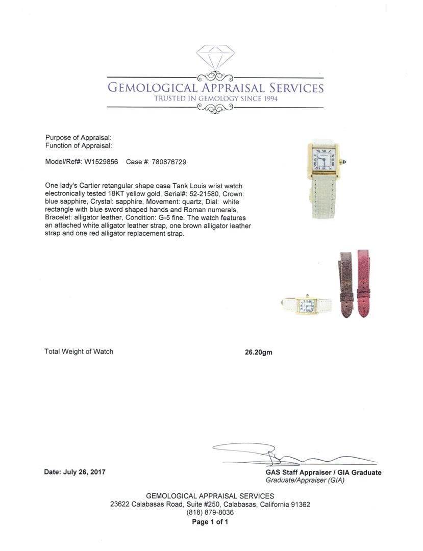 One Ladies Cartier rectangular shape case Tank Louis wrist watch electronically tested 18KT yellow gold, Serial#: 52-21580, Crown: blue sapphire, Crystal: sapphire, Movement: quartz, Dial: white rectangle with blue sword shaped hands and Roman numerals, Bracelet: alligator leather, Condition: G-5 fine. The watch features an attached white alligator leather strap, one brown alligator leather strap and one red alligator replacement strap. Total Weight of Watch 26.20gm. GAS Appraised.