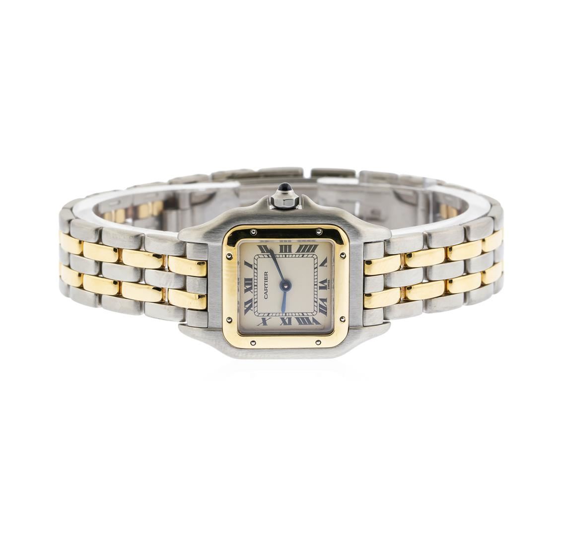 One ladies, Cartier Panthere wristwatch electronically tested, Stainless Steel Case: 30 x 22mm, Case Back: secured by eight inset screws, engraved with the manufacturers name, information, and ID numbers, Cartier Signature Crown: octagonal, set with a Blue cabochon crystal within protective shoulders, Bezel: polished 18KT Yellow gold set with eight inset rivets, Crystal: synthetic sapphire lens. Movement: quartz, Cartier signed Dial: Ivory color, with sword shaped Blue steel hands, Black Cartier Roman numerals and a bordering minute track with bolded five minute intervals, Cartier Panthere Bracelet: three rows of stainless steel links & two rows of 18KT Yellow gold links, Condition: G-5 Fine. Bright polish & brushed finish. Six and one half inch length. Four removable links. Cartier concealed deployment clasp.
