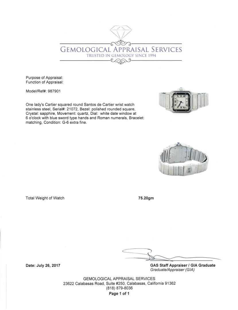 One Ladies Cartier squared round Santos de Cartier wrist watch stainless steel, Serial#: 21072, Bezel: polished rounded square, Crystal: sapphire, Movement: quartz, Dial: white date window at 6 o'clock with blue sword type hands and Roman numerals, Bracelet: matching, Condition: G-6 extra fine. Total Weight of Watch 75.20gm. GAS Appraised.