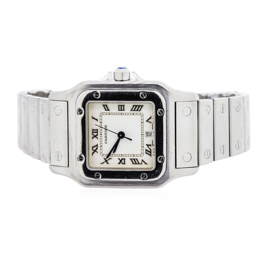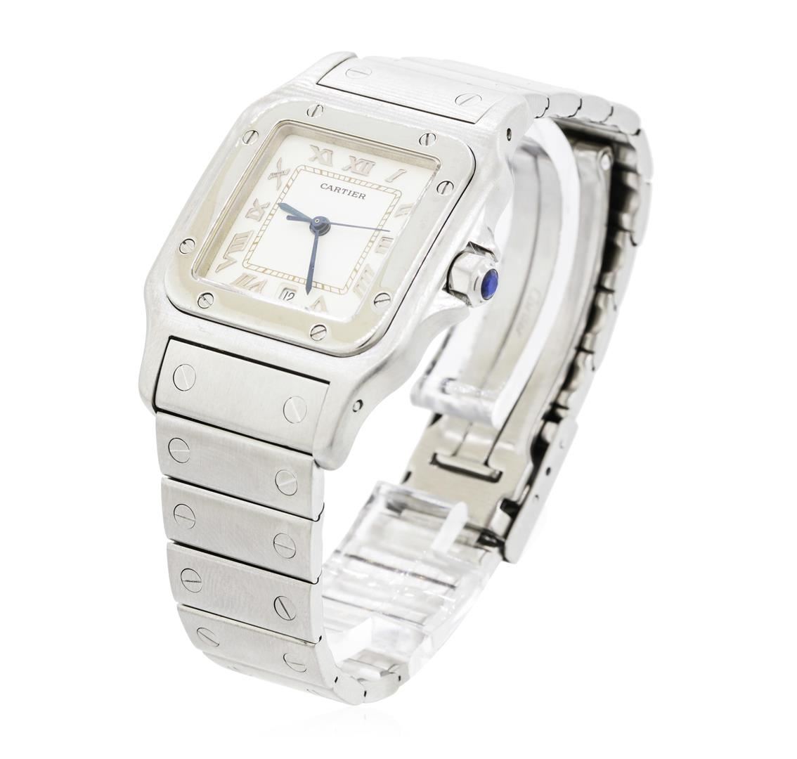 One Ladies Cartier squared round Santos de Cartier wrist watch stainless steel, Serial#: 21072, Bezel: polished rounded square, Crystal: sapphire, Movement: quartz, Dial: white date window at 6 o'clock with blue sword type hands and Roman numerals, Bracelet: matching, Condition: G-6 extra fine. Total Weight of Watch 75.20gm. GAS Appraised.