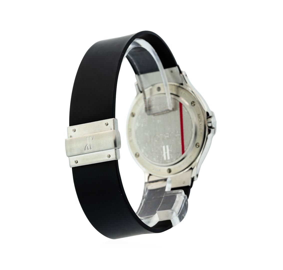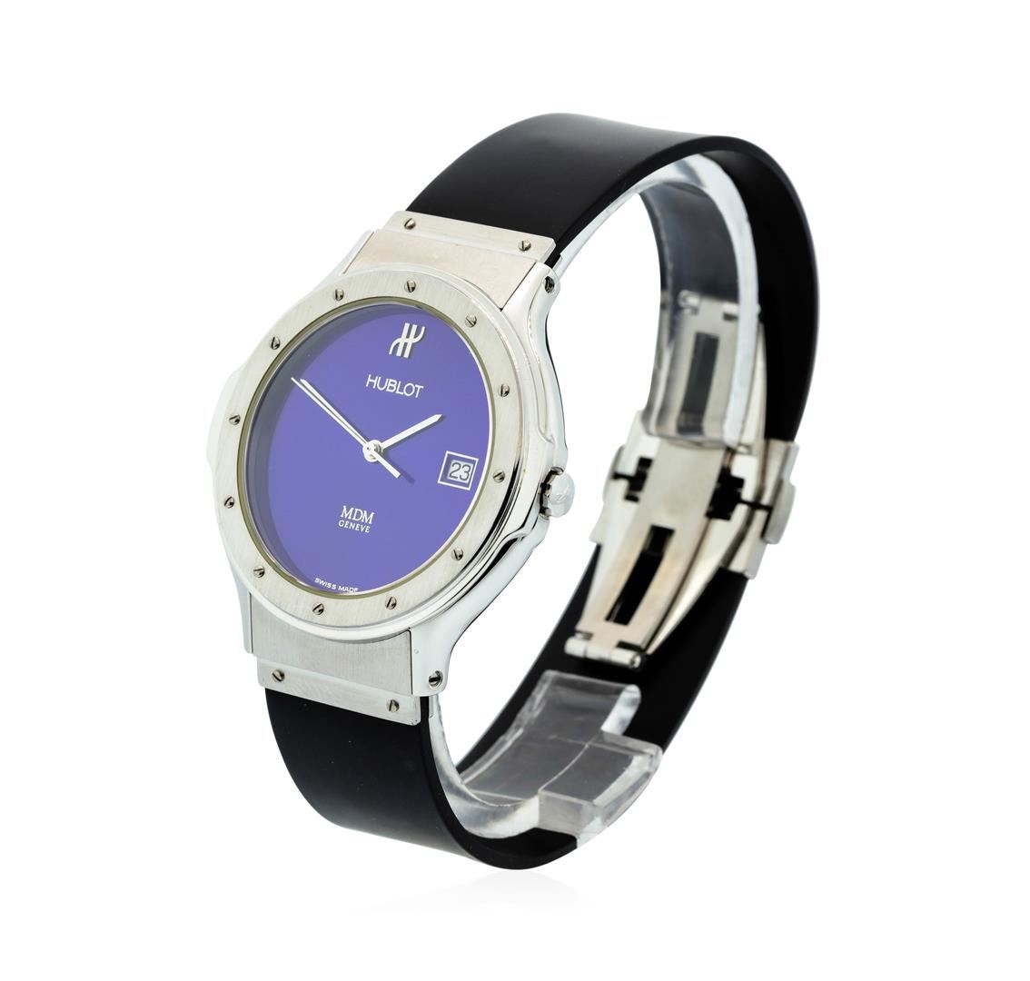 Ladies Hublot Classic MDM Quartz Watch with Midnight Blue Dial. This watch is in very good working condition, and this watch has the following attributes: Case: Stainless Steel approximately 35mm wide, Dial: Midnight Blue, DateWheel: White with Black Numbers, Bracelet: Black Rubber Band with Double deployment stainless steel clasp. The watch comes with warranty book and papers.