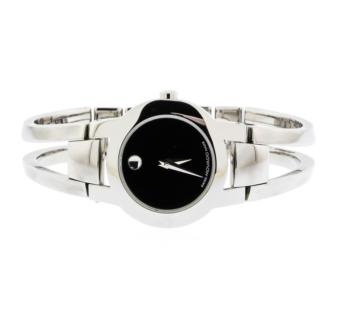 One Ladies Movado Museum Amorosa Bangle Stainless Steel Wristwatch. The watch is in good condition and has the following features: Movement: Swiss Quartz, Case Size: 24mm, Case Material: Stainless Steel, Bracelet Material: Stainless Steel, Gender: Ladies, Dial: Black Museum Dial with Silver Dot Marker and Hands. This watch does not come with a box or papers however we do guarantee it to be authentic.