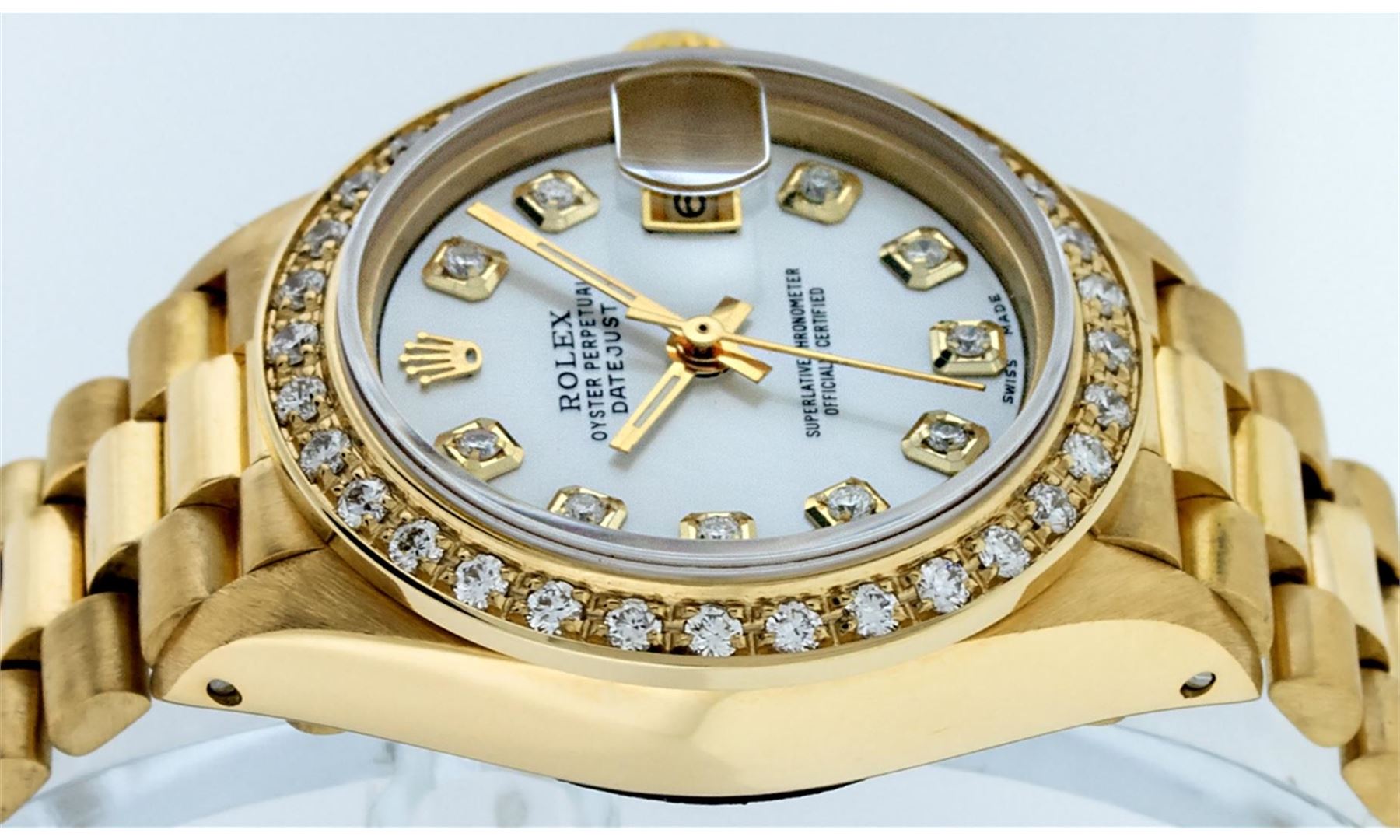 One Ladies 18K Yellow Gold Rolex President Polished, Serviced & Electronically Tested, Yellow Gold Case: 26mm, 18K Yellow Gold Crown, Custom Bezel: 18K Yellow Gold Beadset Diamond Bezel, Diamond Count: 32 Diamonds in Dial. Total Weight .70 Carat, Clarity: SI-VS, Color: G to H. Custom Crystal: Synthetic Sapphire Cyclops Lens. Movement: Automatic Winding Movement Caliber 2030. Custom Dial: Mother Of Pearl Diamond Dial, Stone Count: 10 Diamonds In Dial. Date Window: 3 O'Clock Position, Model: Datejust President, Condition: G-6 Extra Fine. Bracelet: 18K Yellow Gold President With Hidden Clasp, Bright & Satin Polish. 5.5 Inch Length, Standard President Clasp (Hidden Clasp), With Rolex Logo. Watch Has Been Serviced and Polished It Is Free Of All Scratches and Dents.