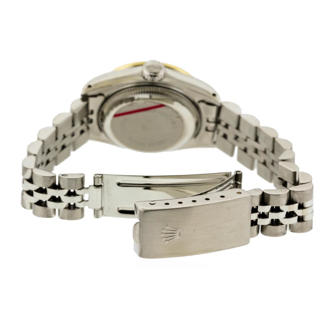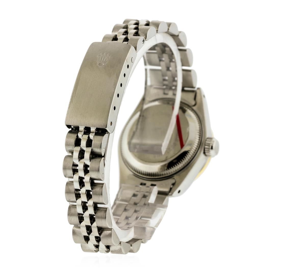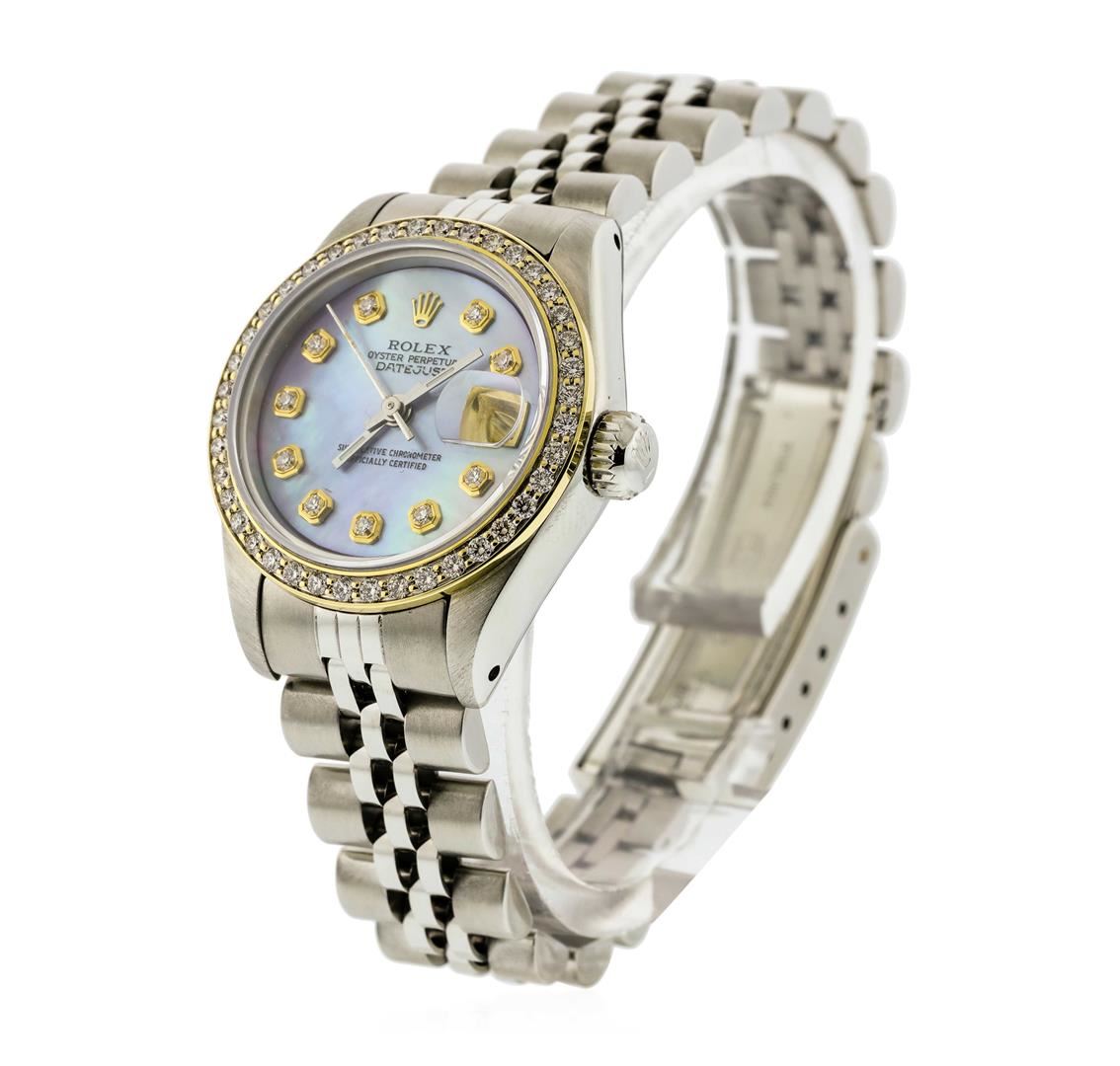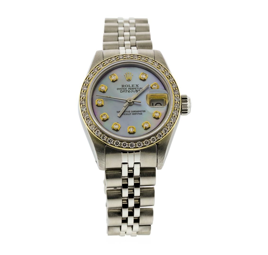 One Ladies Rolex Datejust Polished Bright with Satin Finish, Serviced & Electronically Tested, Stainless Steel Case: 26mm, Stainless Steel Crown, Custom Bezel: 18K Yellow Gold Diamond Bezel, Diamond Count: 42 Diamonds with a Total Approximate Weight 0.42 Carats, Clarity: SI-VS, Color: G to H. Custom Crystal: Synthetic Sapphire Cyclops Lens. Movement: Automatic Winding Movement. Custom Dial: Mother of Pearl with Diamond Markers. Diamond Count: 10 Diamonds on Dial, Color: G To H, VS to SI1. Date Window: 3 O'Clock Position Date Display with Quickset, Model: 69190 Datejust Condition: G-6 Extra Fine. Bracelet: Stainless Steel Jubilee, Bright Polish & Satin Finish with Adjustable Standard Clasp, With Rolex Logo.