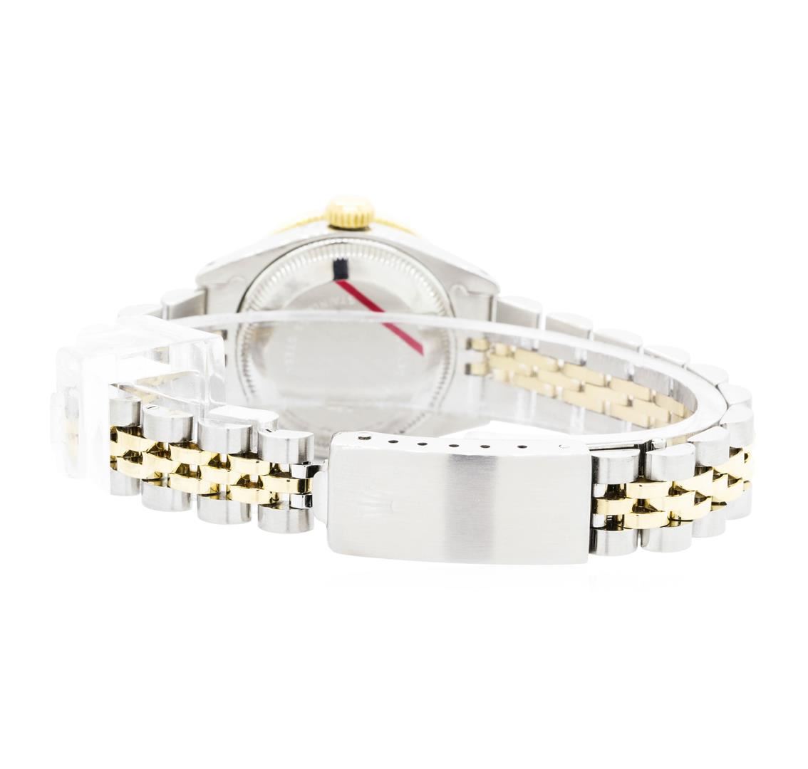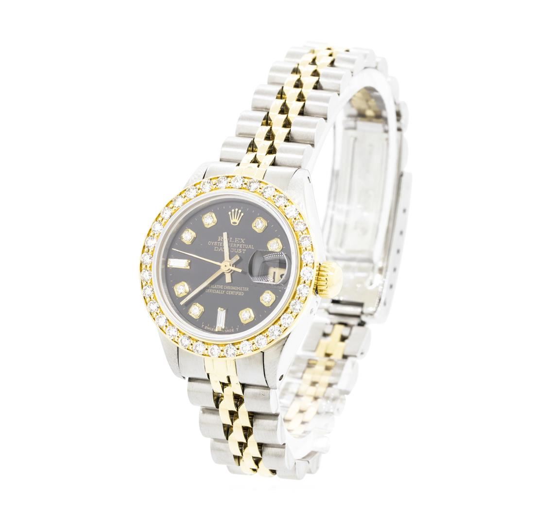 One Ladies, hand crafted and machine milled Rolex Oyster perpetual datejust wrist watch two-tone, Serial#: 6279769, Crown: screw-down, Bezel: custom 18KT yellow gold diamond set, Crystal: sapphire, Movement: superlative chronometer, Dial: black baton, pointed type hands and diamond marker numerals, Bracelet: stainless steel and 18KT yellow gold Jubilee, Condition: G-5 fine. Containing: Thirty-Two prong set round brilliant cut diamonds, measuring 2.00 - 1.95 x 1.23mm (depth est.) approximate total weight of 32 Stones = 0.95ct. Graded in the setting. Color G - H Clarity VS-1 to VS-2 Cut Very Good Two prong set baguette cut diamonds, measuring 3.00 x 1.00 x 0.85mm (depth est.) approximate total weight of 2 Stones = 0.05ct. Graded in the setting. Color G Clarity VS-1 Cut Good Eight prong set single cut diamonds, measuring 1.60 - 1.60 x 0.99mm (depth est.) approximate total weight of 8 Stones = 0.12ct. Graded in the setting. Color F - G Clarity VS-1 to VS-2 Cut Very Good. Total Weight of Diamonds 1.12ct. Total Weight of Watch 54.80gm. GAS Appraised.