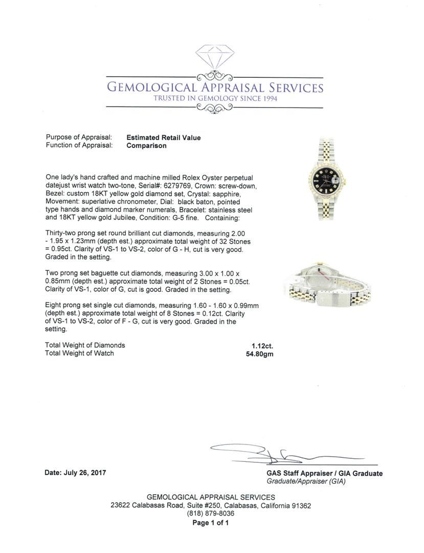 One Ladies, hand crafted and machine milled Rolex Oyster perpetual datejust wrist watch two-tone, Serial#: 6279769, Crown: screw-down, Bezel: custom 18KT yellow gold diamond set, Crystal: sapphire, Movement: superlative chronometer, Dial: black baton, pointed type hands and diamond marker numerals, Bracelet: stainless steel and 18KT yellow gold Jubilee, Condition: G-5 fine. Containing: Thirty-Two prong set round brilliant cut diamonds, measuring 2.00 - 1.95 x 1.23mm (depth est.) approximate total weight of 32 Stones = 0.95ct. Graded in the setting. Color G - H Clarity VS-1 to VS-2 Cut Very Good Two prong set baguette cut diamonds, measuring 3.00 x 1.00 x 0.85mm (depth est.) approximate total weight of 2 Stones = 0.05ct. Graded in the setting. Color G Clarity VS-1 Cut Good Eight prong set single cut diamonds, measuring 1.60 - 1.60 x 0.99mm (depth est.) approximate total weight of 8 Stones = 0.12ct. Graded in the setting. Color F - G Clarity VS-1 to VS-2 Cut Very Good. Total Weight of Diamonds 1.12ct. Total Weight of Watch 54.80gm. GAS Appraised.