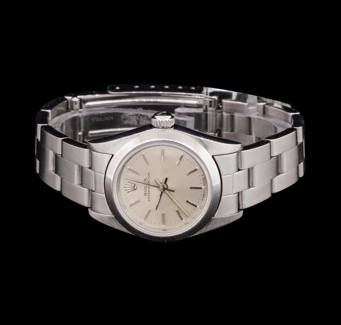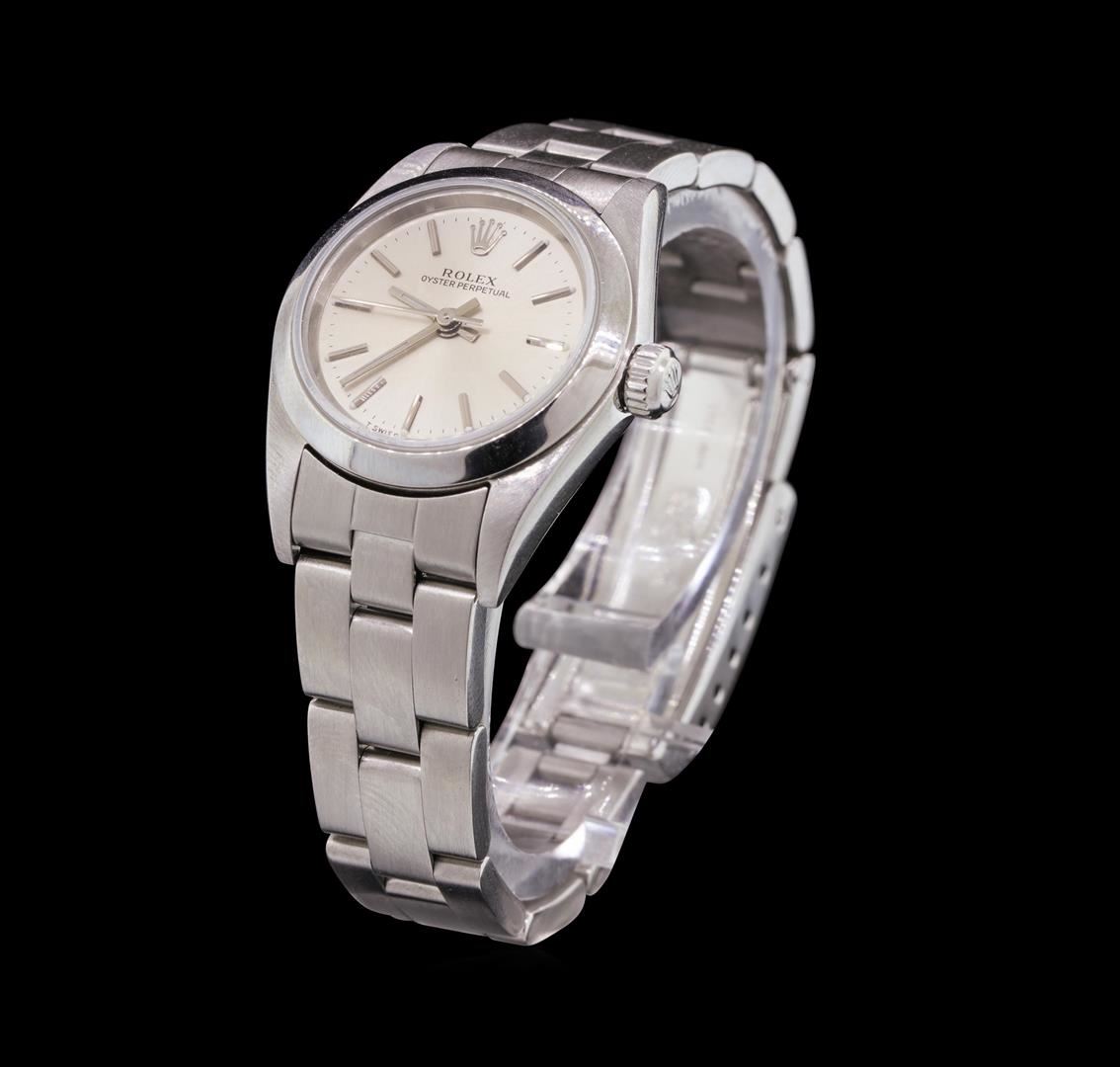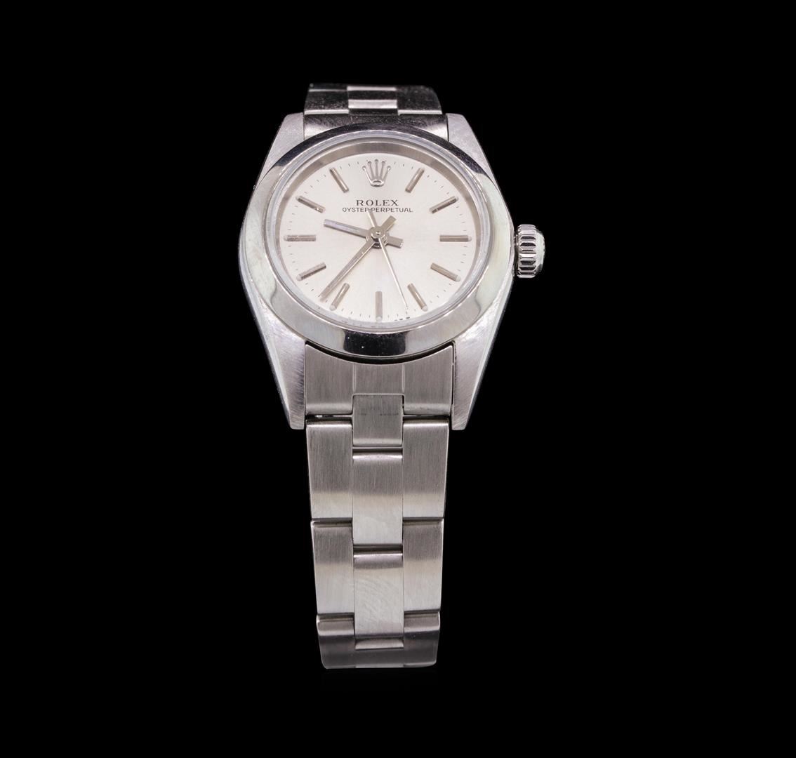 One ladies, Rolex Oyster Perpetual model Stainless Steel wristwatch electronically tested, Case: 25mm oyster, Rolex Signature Crown: twinlock with high relief logo, 18KT White Gold Bezel: polished, Rolex Hallmarked Crystal: synthetic sapphire lens, Circa: 1990.Movement: mechanical, stem wind, Rolex signed Dial: Silver color, with baton hands and raised indices, Condition: G-7 Near Mint, Rolex Bracelet: brushed finish stainless steel tapering oyster links. Six and one quarter inch length, adjustable. Rolex & Swiss Hallmarked clasp, with high relief logo. Total Weight of Watch 45.54gm. AIG Appraised.