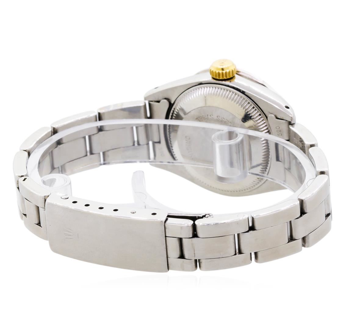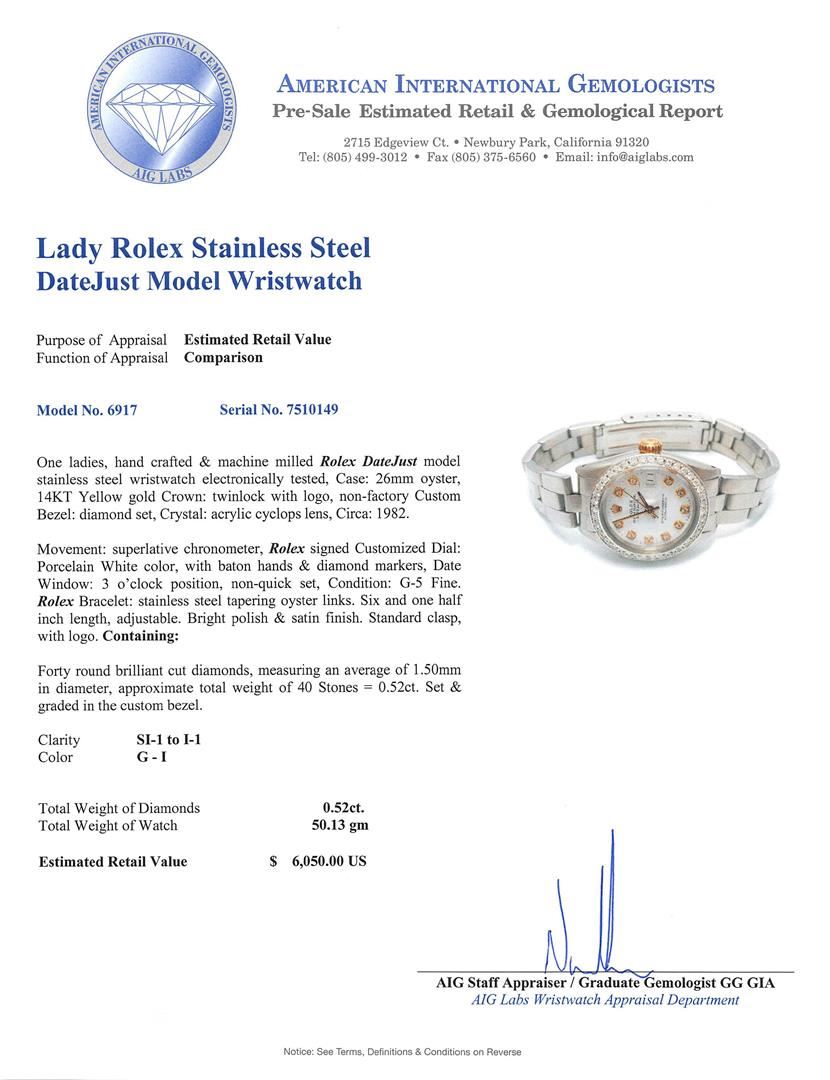 One ladies, hand crafted & machine milled Rolex DateJust model stainless steel wristwatch electronically tested, Case: 26mm oyster, 14KT Yellow gold Crown: twinlock with logo, non-factory Custom Bezel: diamond set, Crystal: acrylic cyclops lens, Circa: 1982. Movement: superlative chronometer, Rolex signed Customized Dial: Porcelain White color, with baton hands & diamond markers, Date Window: 3 o'clock position, non-quick set, Condition: G-5 Fine. Rolex Bracelet: stainless steel tapering oyster links. Six and one half inch length, adjustable. Bright polish & satin finish. Standard clasp, with logo. Containing: Forty round brilliant cut diamonds, measuring an average of 1.50mm in diameter, approximate total weight of 40 Stones = 0.52ct. Set & graded in the custom bezel. Clarity: SI-1 to I-1. Color: G - I. Total Weight of Diamonds 0.52ct. Total Weight of Watch 50.13gm. AIG Appraised at $6,050.00.