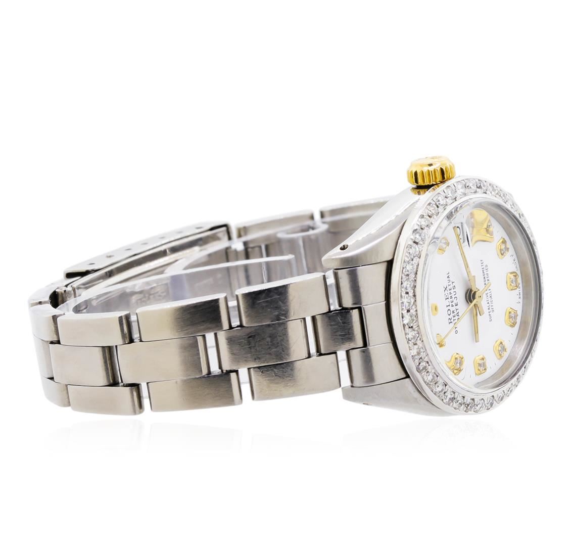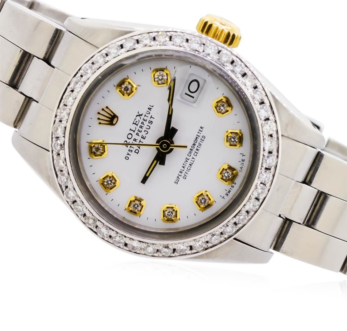 One ladies, hand crafted & machine milled Rolex DateJust model stainless steel wristwatch electronically tested, Case: 26mm oyster, 14KT Yellow gold Crown: twinlock with logo, non-factory Custom Bezel: diamond set, Crystal: acrylic cyclops lens, Circa: 1982. Movement: superlative chronometer, Rolex signed Customized Dial: Porcelain White color, with baton hands & diamond markers, Date Window: 3 o'clock position, non-quick set, Condition: G-5 Fine. Rolex Bracelet: stainless steel tapering oyster links. Six and one half inch length, adjustable. Bright polish & satin finish. Standard clasp, with logo. Containing: Forty round brilliant cut diamonds, measuring an average of 1.50mm in diameter, approximate total weight of 40 Stones = 0.52ct. Set & graded in the custom bezel. Clarity: SI-1 to I-1. Color: G - I. Total Weight of Diamonds 0.52ct. Total Weight of Watch 50.13gm. AIG Appraised at $6,050.00.