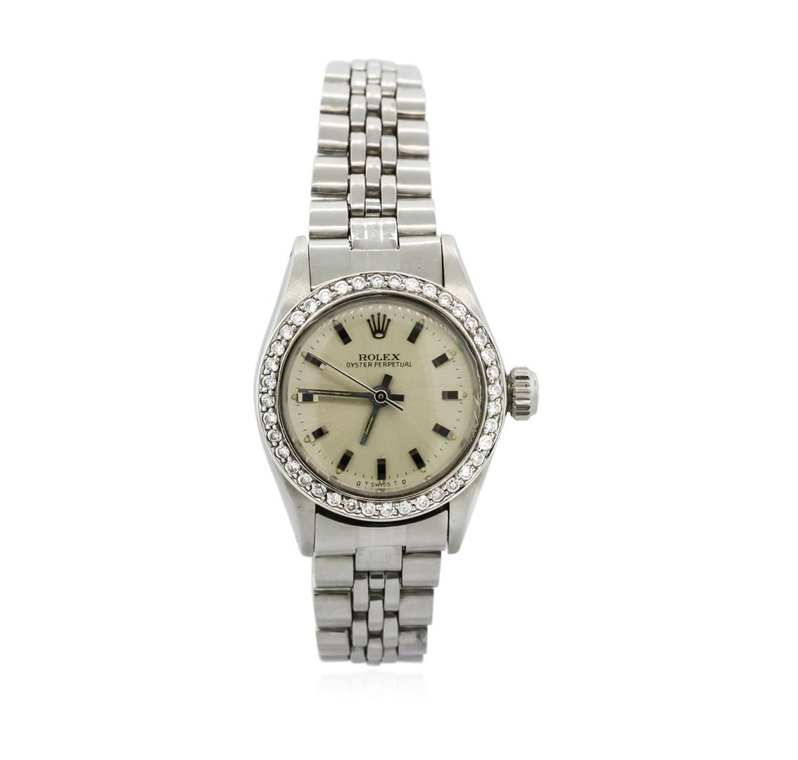 One ladies, hand crafted & machine milled Rolex Oyster Perpetual model Stainless Steel wristwatch electronically tested, Case: 25mm oyster, Crown: twinlock with logo, non-factory Custom Bezel: diamond set, Crystal: acrylic lens. Movement: mechanical stem wind, Dial: Silvered, with luminous baton hands and indices, Circa: 1971, Condition: G-4 Average, Bracelet: bright & brushed finish stainless steel tapering jubilee link. Six and one half inch length, adjustable. Containing: Forty round brilliant cut diamonds, measuring an average of 1.50mm in diameter, approximate. Total Weight of 40 Stones = 0.36ct. Set & graded in the bezel. Clarity: SI-1 to I-1. Color: G - I. Total Weight of Diamonds 0.36ct. Total Weight of Watch 40.00gm. AIG Appraised at $3,990.00.