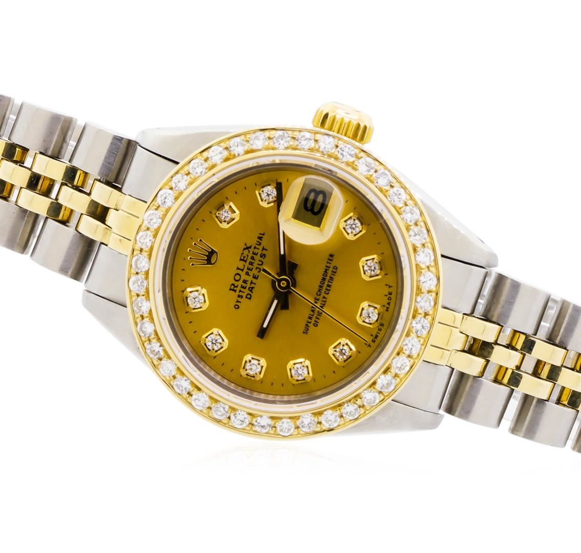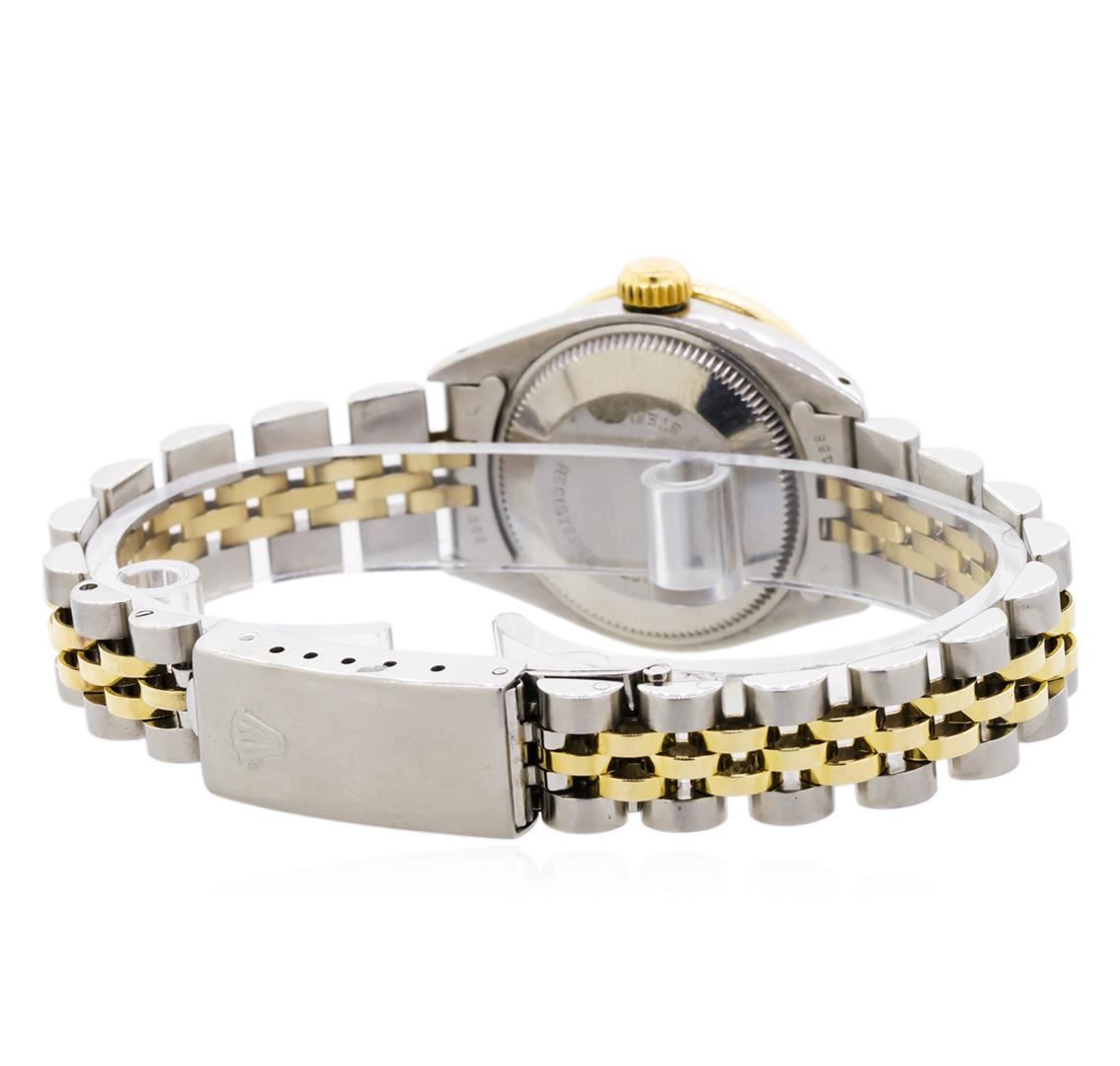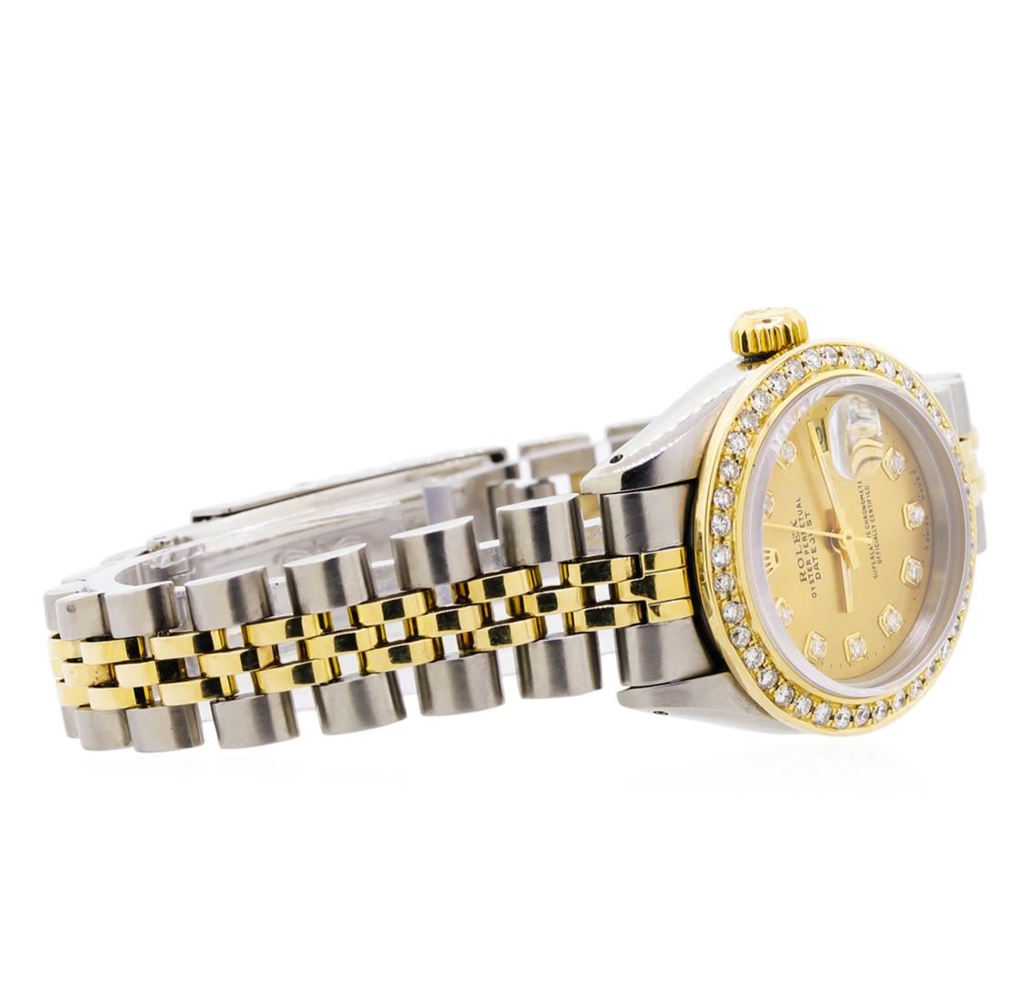 One ladies, hand crafted & machine milled Rolex DateJust Model wristwatch electronically tested, Stainless Steel Case: 26mm oyster, 14KT Yellow gold Crown: twinlock with logo, non-factory Custom Bezel: diamond set, non-factory Custom Crystal: synthetic sapphire cyclops lens, Circa: 1982.Movement: superlative chronometer, Rolex signed Dial: Champagne color, with baton hands & diamond markers, Calendar: 3 o'clock position date display, Ivory color, non-quick set, Condition: G-5 Fine, Rolex Bracelet: stainless steel and 14KT yellow gold jubilee links. Six and one half inch length, adjustable. Standard clasp, with logo. Containing: Forty prong set round brilliant cut diamonds, measuring an average of 1.50mm in diameter, approximate total weight of 40 Stones = 0.52ct. Set & graded in the custom bezel. Clarity: SI-1 to I-1. Color: G - H. Total Weight of Diamonds 0.52ct. Total Weight of Watch 52.05gm. AIG Appraised at $7,050.00.