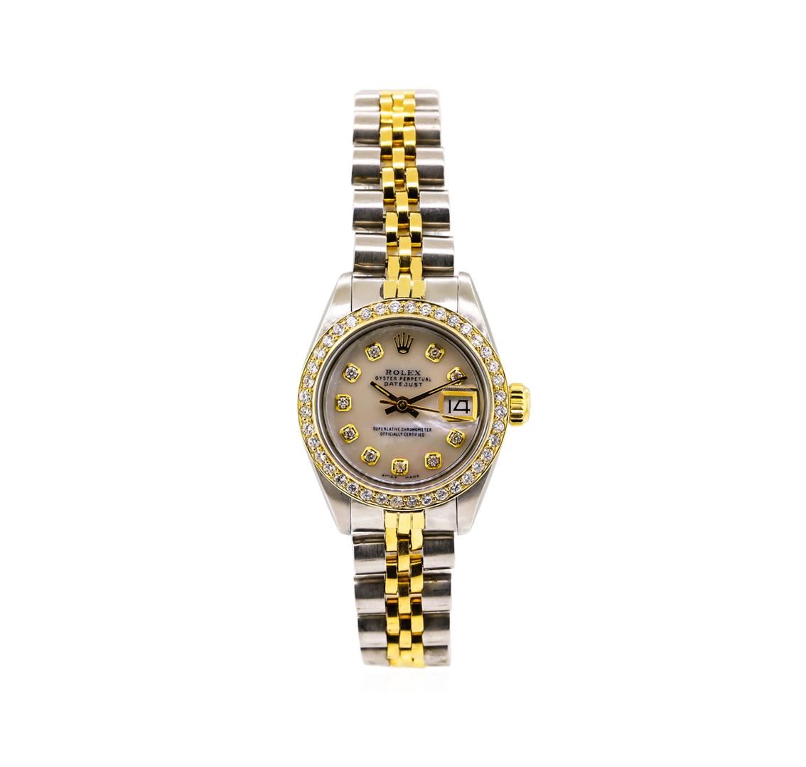 One ladies, hand crafted & machine milled Rolex DateJust Model wristwatch electronically tested, Stainless Steel Case: 26mm oyster, 14KT Yellow gold Crown: twinlock with logo, non-factory Custom Bezel: diamond set, Crystal: acrylic cyclops lens. Movement: AIG Appraised at $7,220.00.