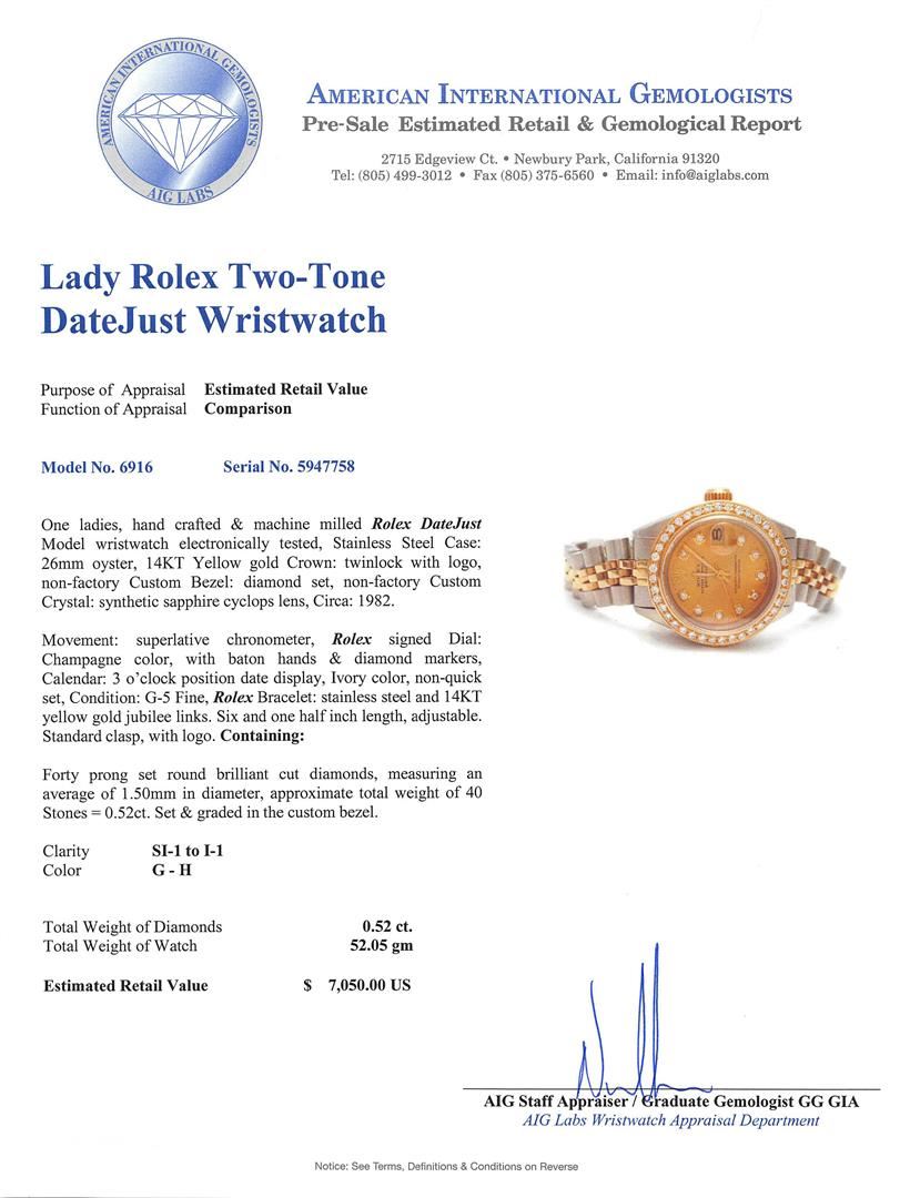 One ladies, hand crafted & machine milled Rolex DateJust Model wristwatch electronically tested, Stainless Steel Case: 26mm oyster, 14KT Yellow gold Crown: twinlock with logo, non-factory Custom Bezel: diamond set, non-factory Custom Crystal: synthetic sapphire cyclops lens, Circa: 1982.Movement: superlative chronometer, Rolex signed Dial: Champagne color, with baton hands & diamond markers, Calendar: 3 o'clock position date display, Ivory color, non-quick set, Condition: G-5 Fine, Rolex Bracelet: stainless steel and 14KT yellow gold jubilee links. Six and one half inch length, adjustable. Standard clasp, with logo. Containing: Forty prong set round brilliant cut diamonds, measuring an average of 1.50mm in diameter, approximate total weight of 40 Stones = 0.52ct. Set & graded in the custom bezel. Clarity: SI-1 to I-1. Color: G - H. Total Weight of Diamonds 0.52ct. Total Weight of Watch 52.05gm. AIG Appraised at $7,050.00.