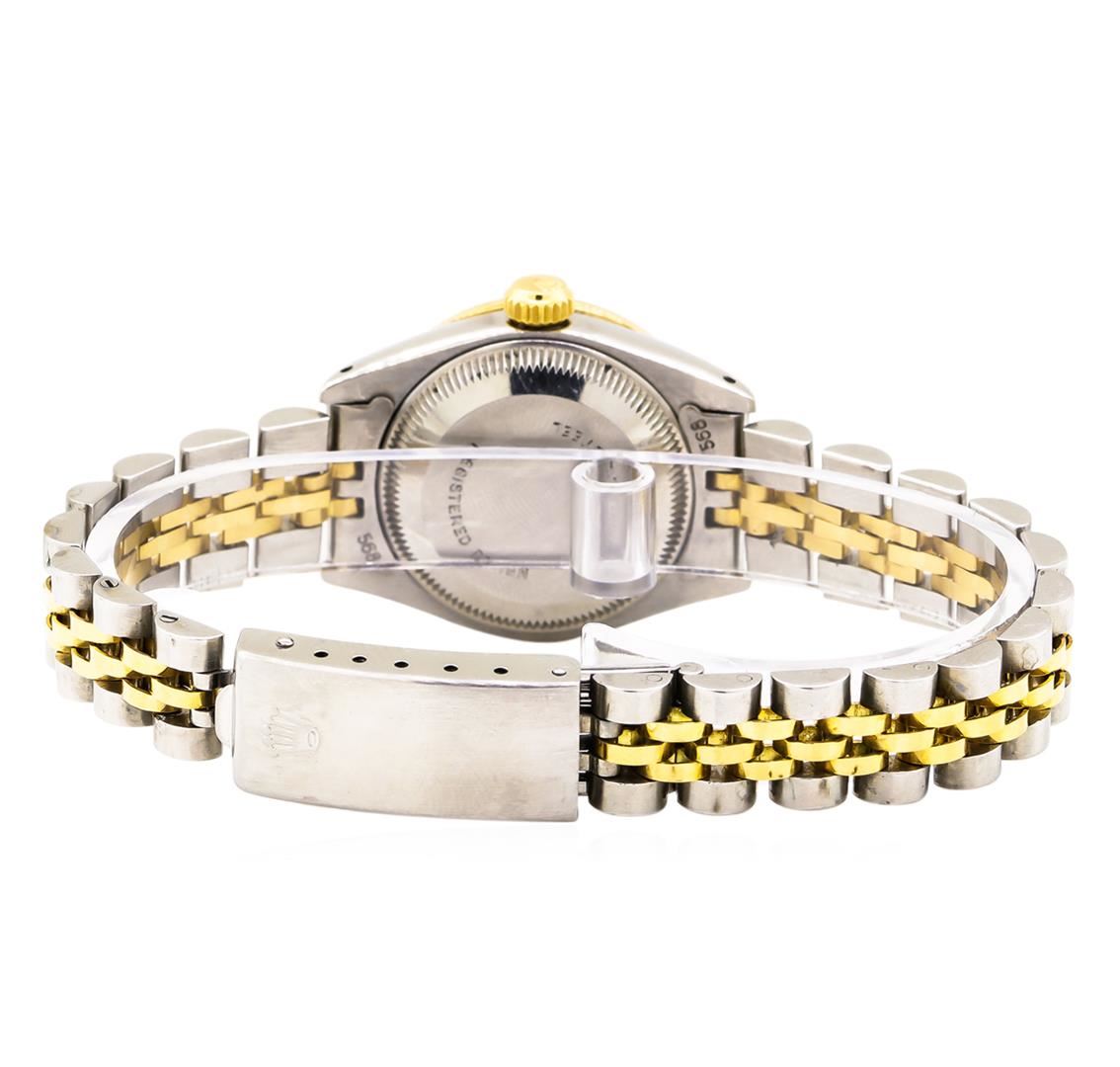 One ladies, hand crafted & machine milled Rolex DateJust Model wristwatch electronically tested, Stainless Steel Case: 26mm oyster, 14KT Yellow gold Crown: twinlock with logo, non-factory Custom Bezel: diamond set, Crystal: acrylic cyclops lens. Movement: superlative chronometer, Rolex signed Customized Dial: mother of pearl, with baton hands & diamond markers, Calendar: 3 o'clock position date display, Light Ivory color, non-quick set, Circa: 1980, Condition: G-5 Fine, Rolex Bracelet: stainless steel and 14KT yellow gold jubilee links. Six and three quarter inch length, adjustable. Rolex Hallmarked clasp, with logo. Containing: Forty prong set round brilliant diamonds, measuring an average of 1.60mm in diameter, approximate total weight of 40 stones equals 0.62ct. Set & graded in the custom bezel. Clarity: VS-2 to SI-1 Average. Color: F - H. Total Weight of Diamonds 0.62ct. Total Weight of Watch 52.09gm. AIG Appraised at $7,220.00.